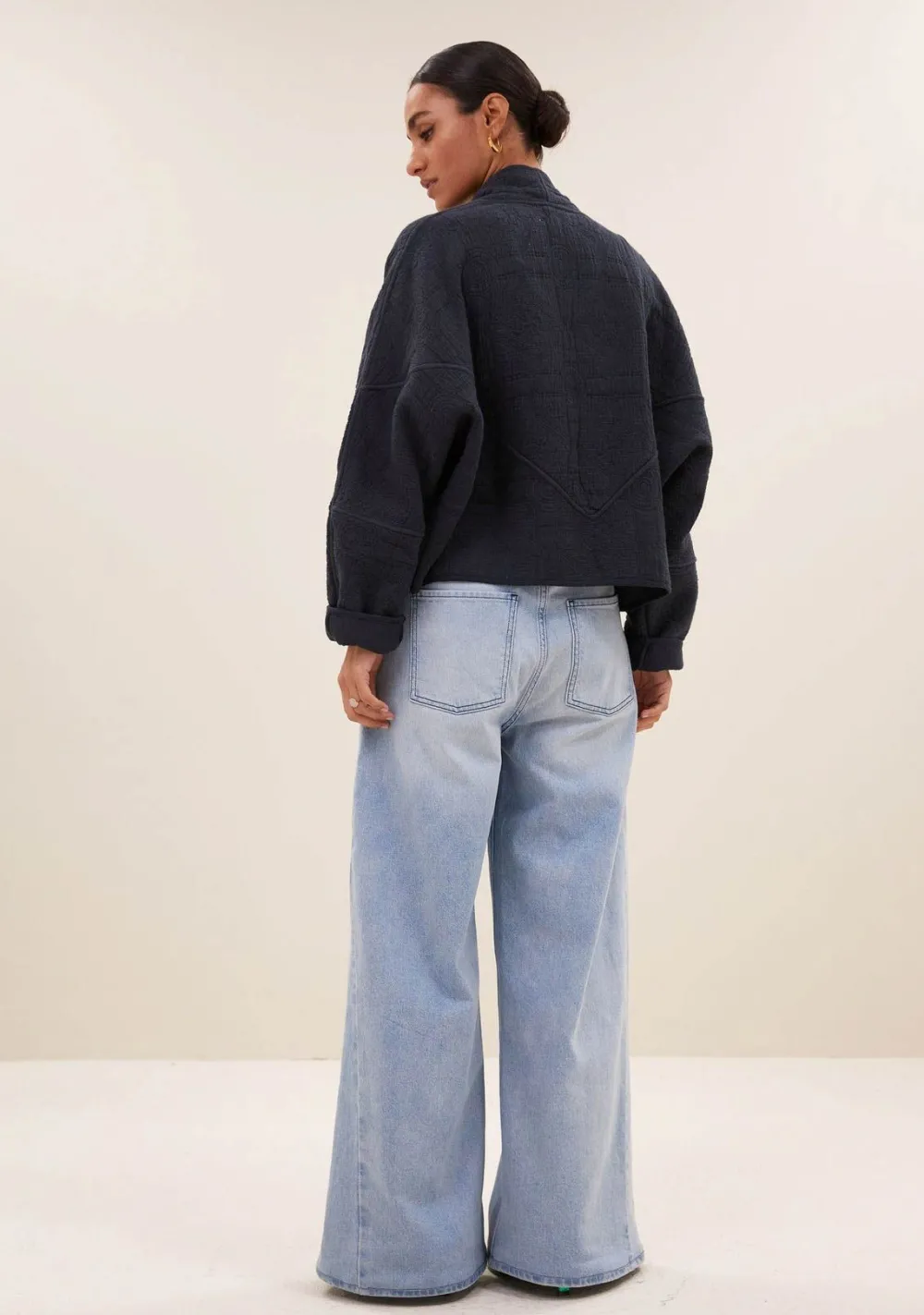 – Het model is 1.75m lang en draagt maat S