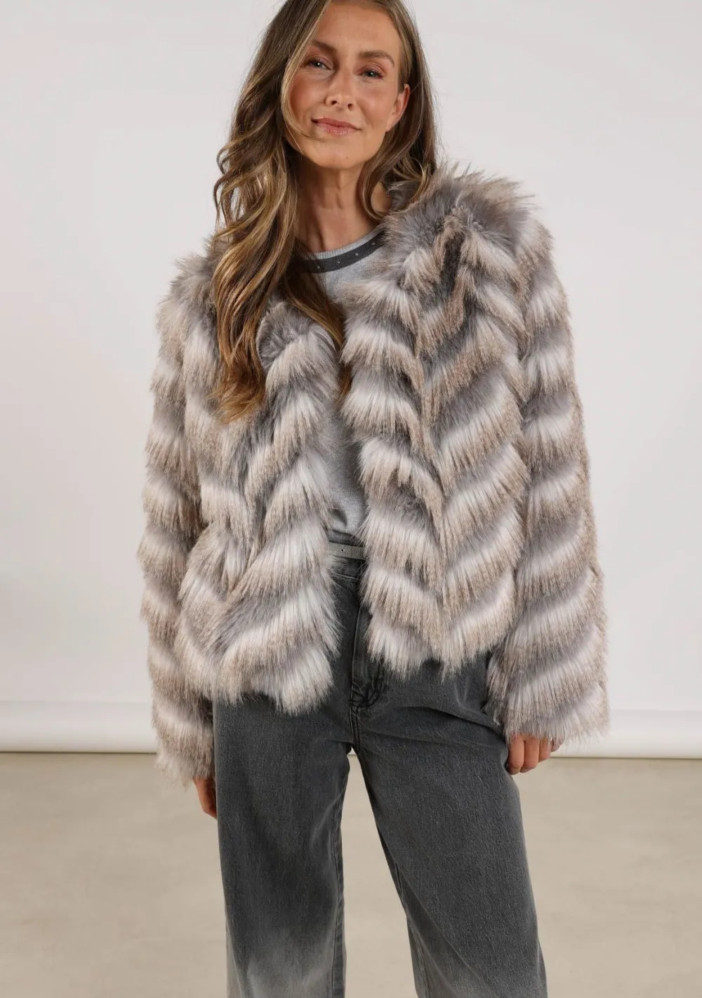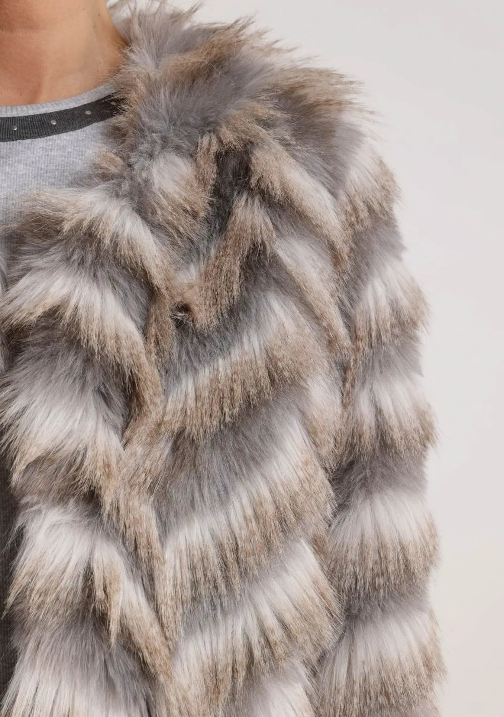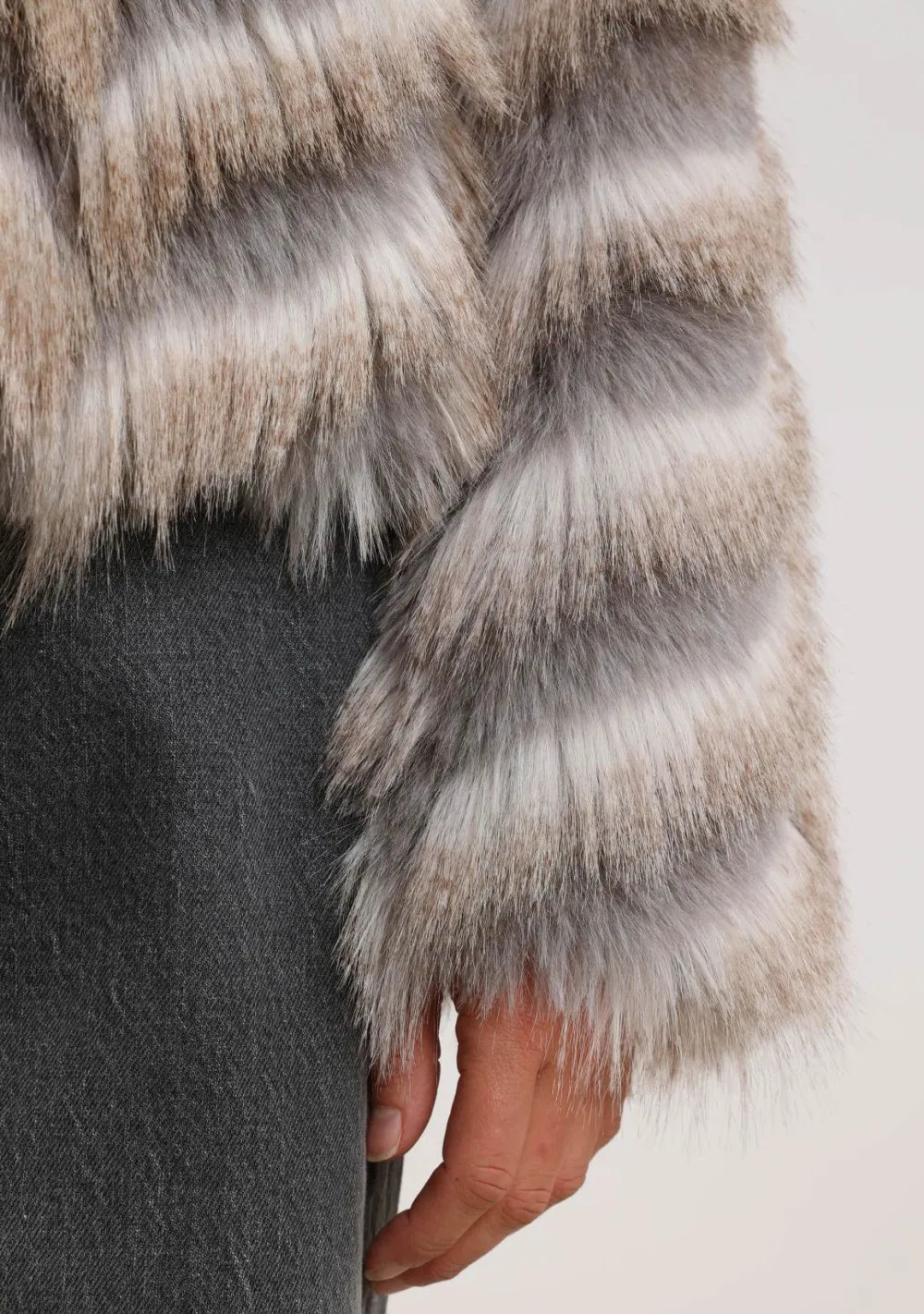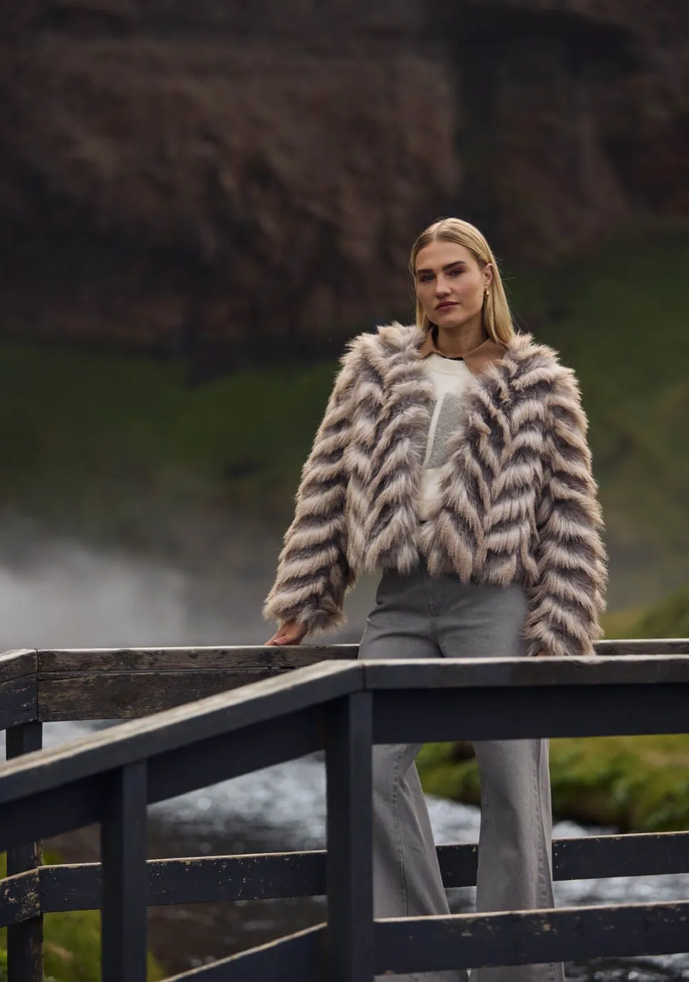 – Het model is 1.76m lang en draagt maat S