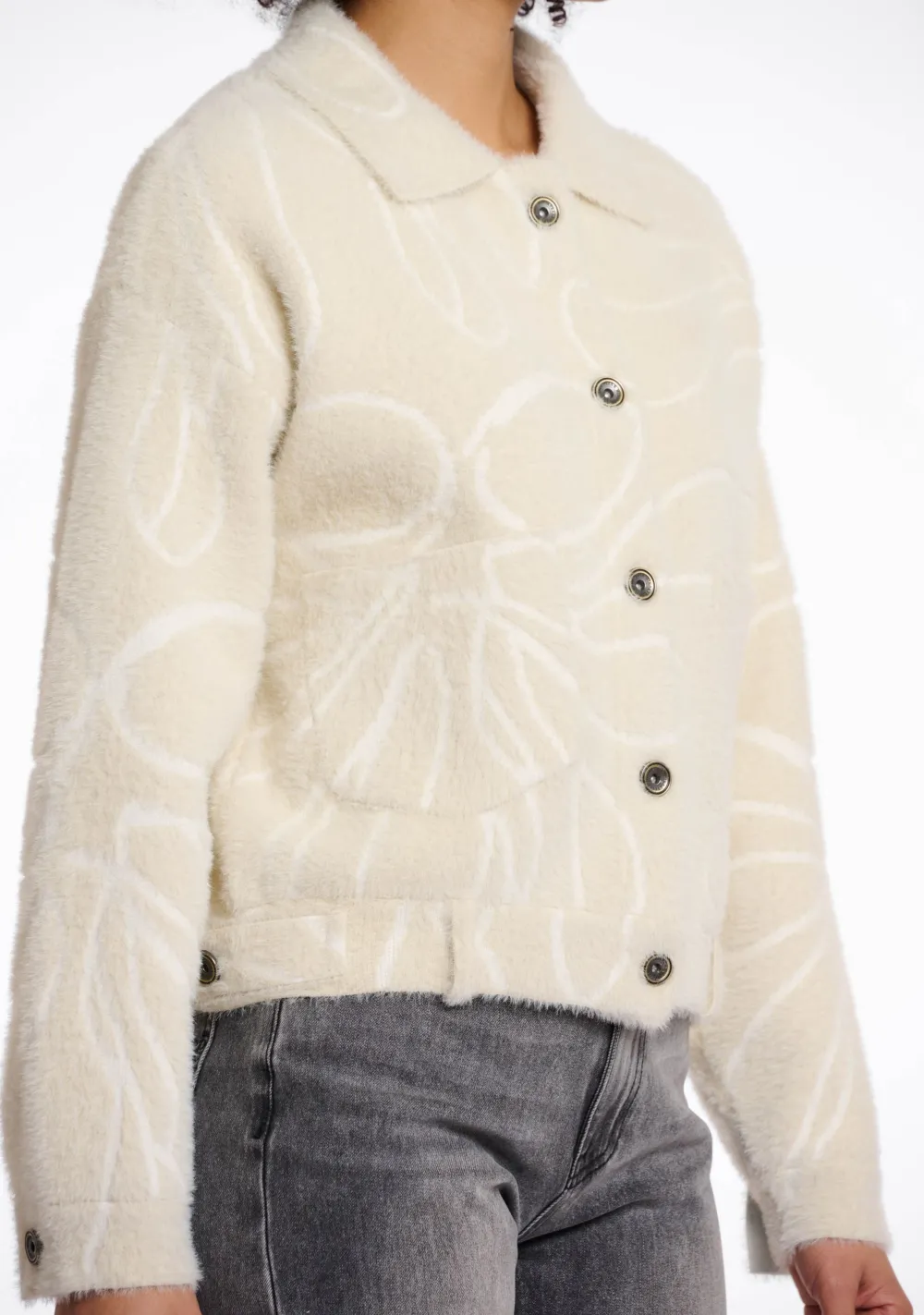 – Het model is 1.76m lang en draagt maat S