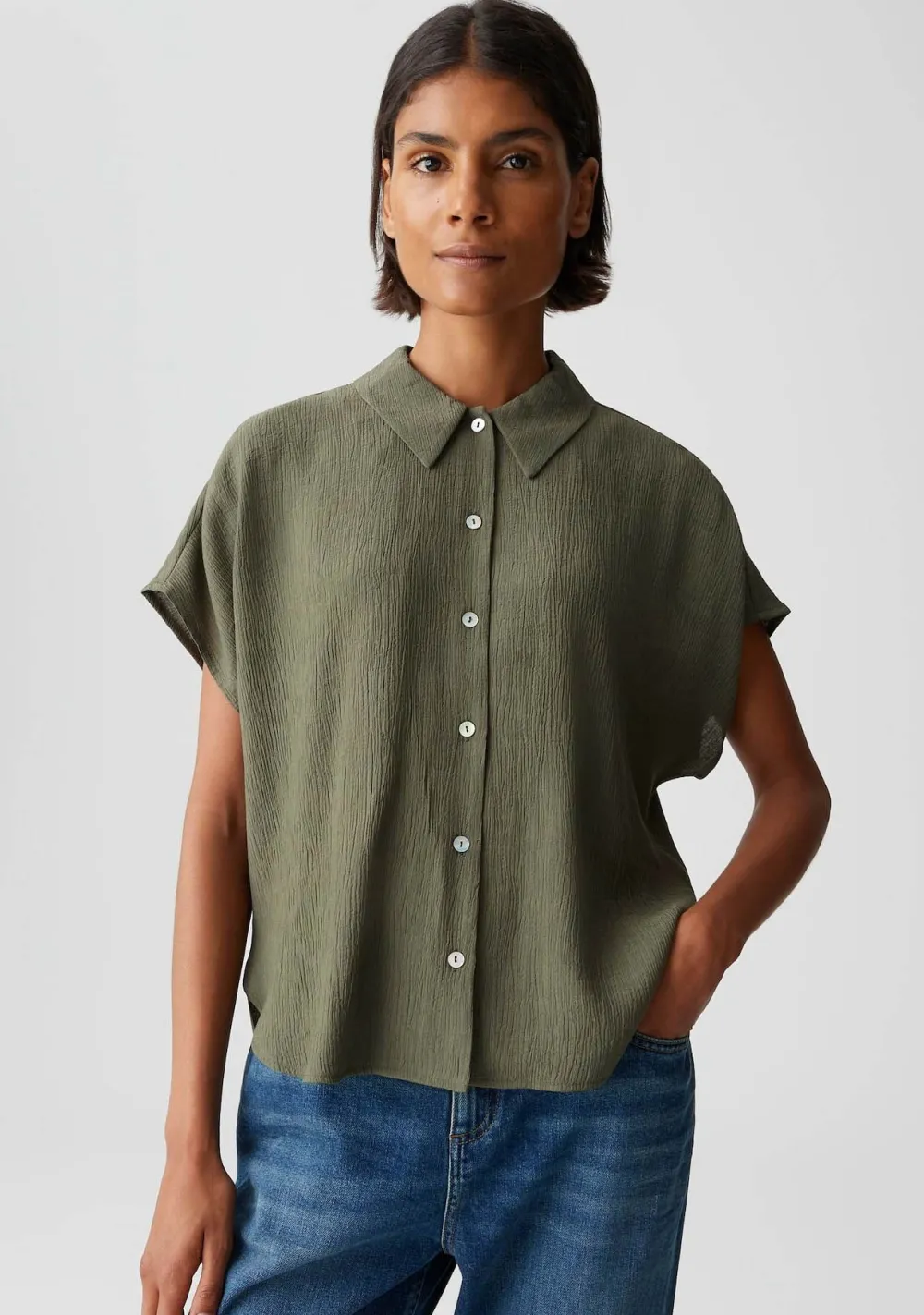 Let op: de kleur van de groene blouse kan op de foto’s afwijken. De blouse is in werkelijkheid kaki van kleur, maar kan op de foto’s soms een bruine tint lijken te hebben.