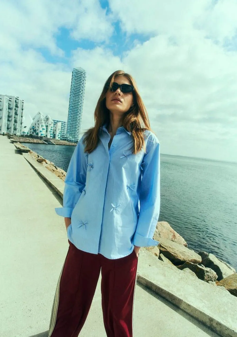 – Het model is 1.76m lang en draagt maat S