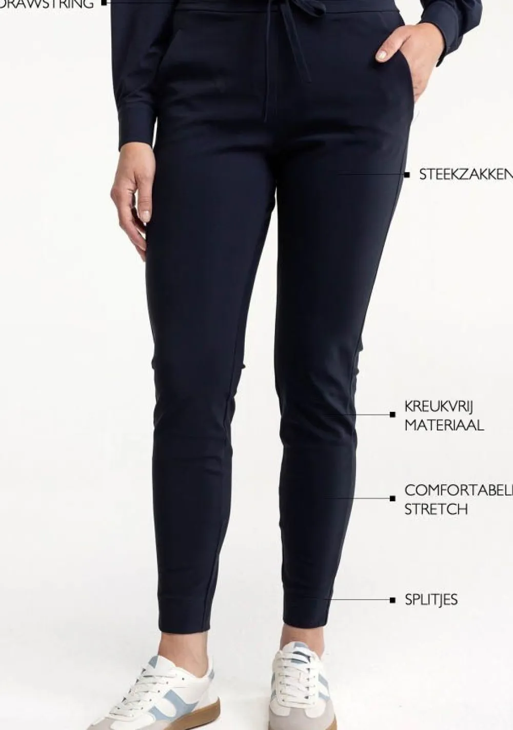 De broek is gemaakt van travel bonded-materiaal, dat bekend staat om zijn stevigheid en comfort. Deze stof is niet alleen soepel en rekbaar, maar ook kreukvrij en ademend, waardoor het ideaal is voor drukke dagen of lange reizen. De handige steekzakken maken het ontwerp nog praktischer, en met een binnenbeenlengte van 78 cm zit deze broek als gegoten.