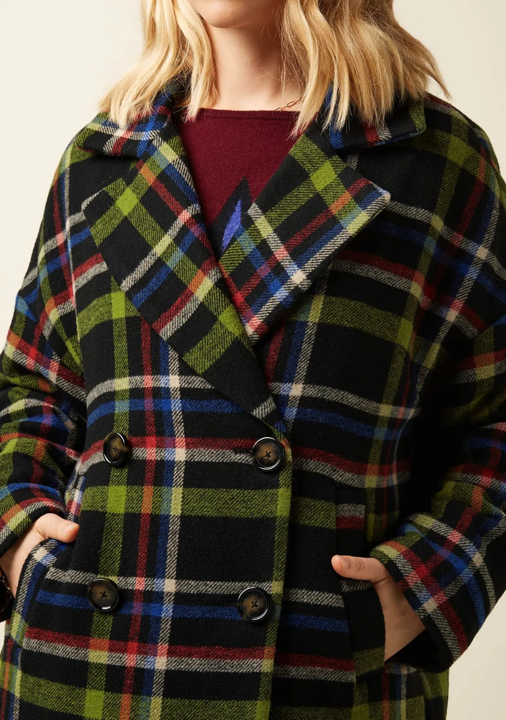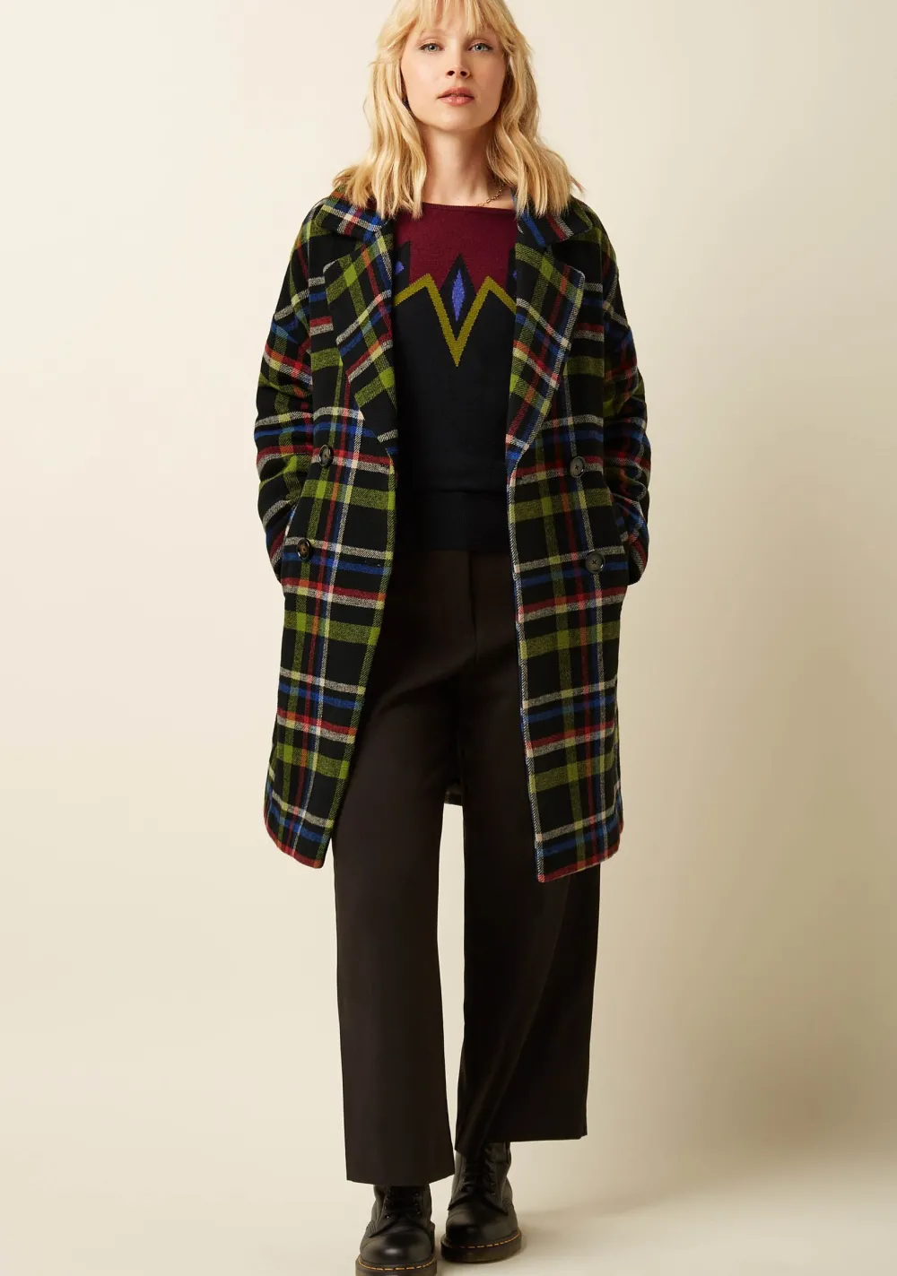 – Het model is 1.71m lang en draagt maat 36
