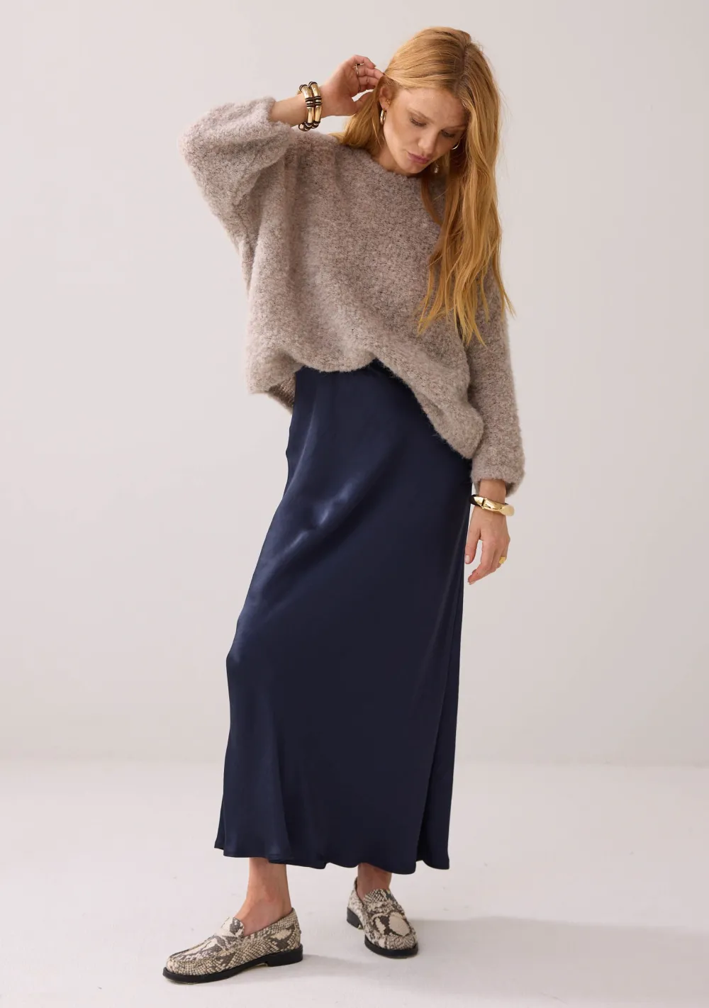 – Het model is 1.76m lang en draagt maat 36
