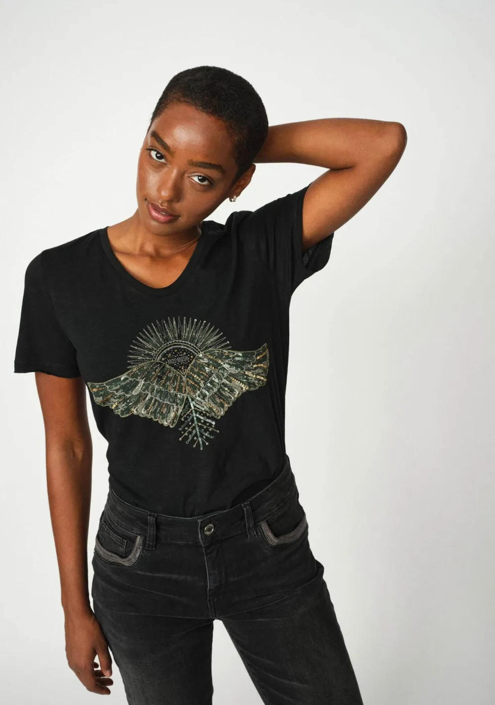 – Het model is 1.76m lang en draagt maat S