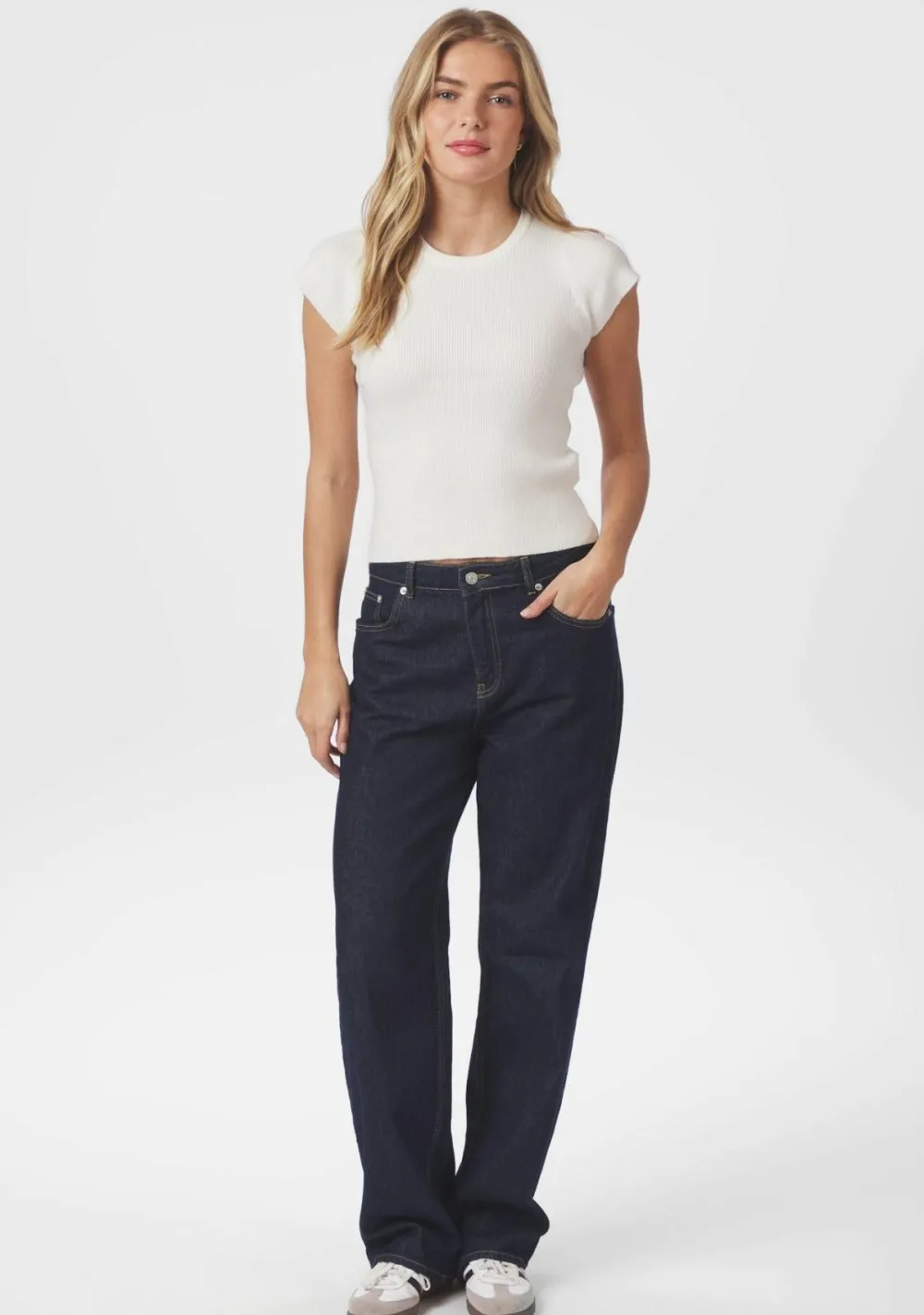 – Het model is 1.76m lang en draagt maat 36