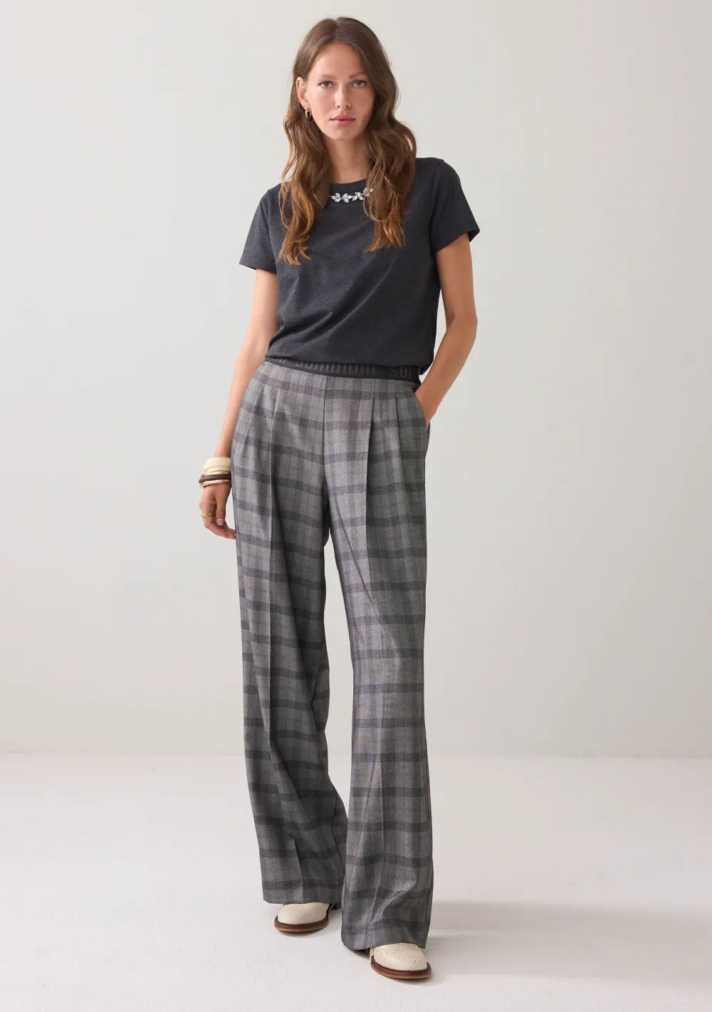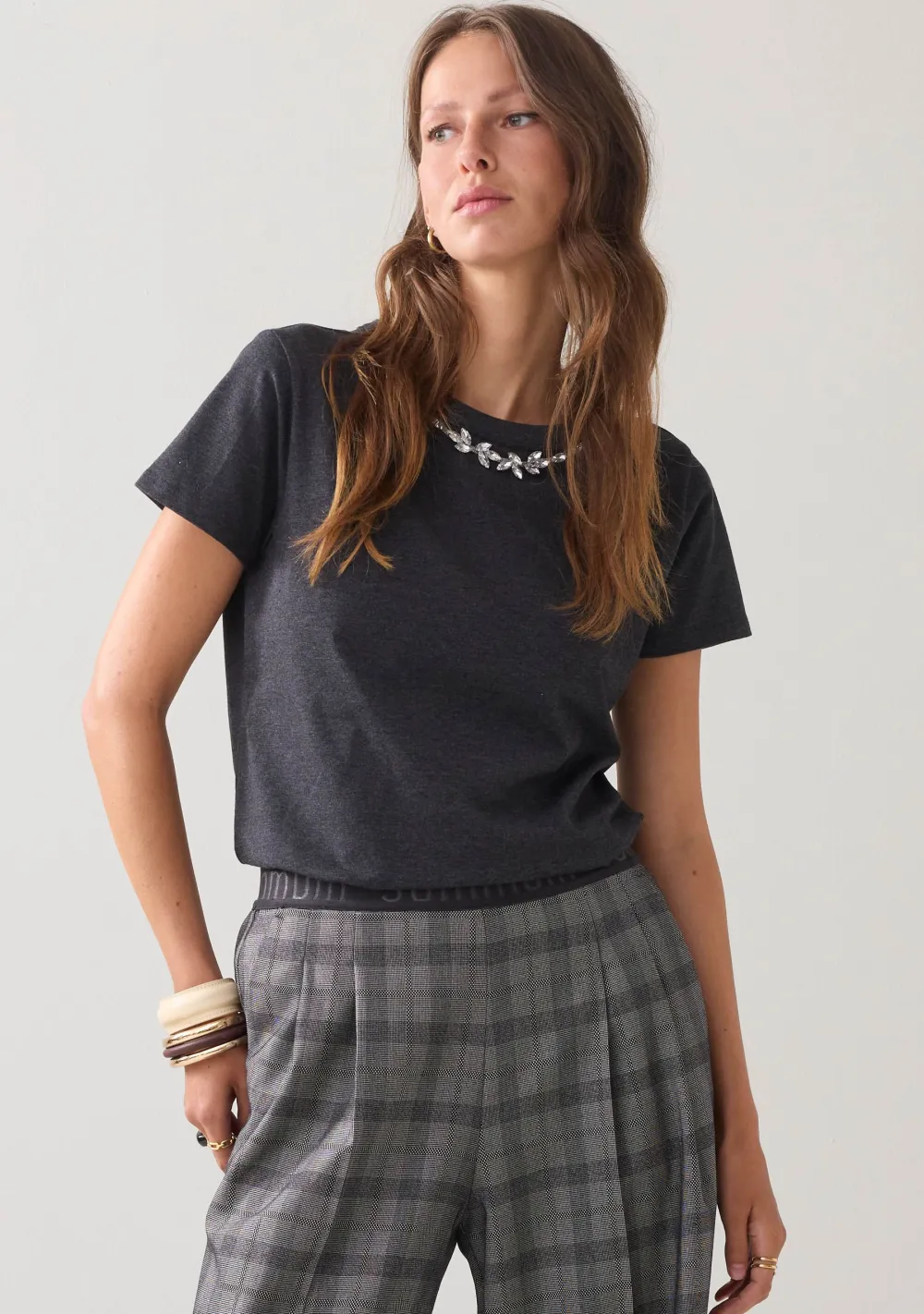 – Het model is 1.76m lang en draagt maat S