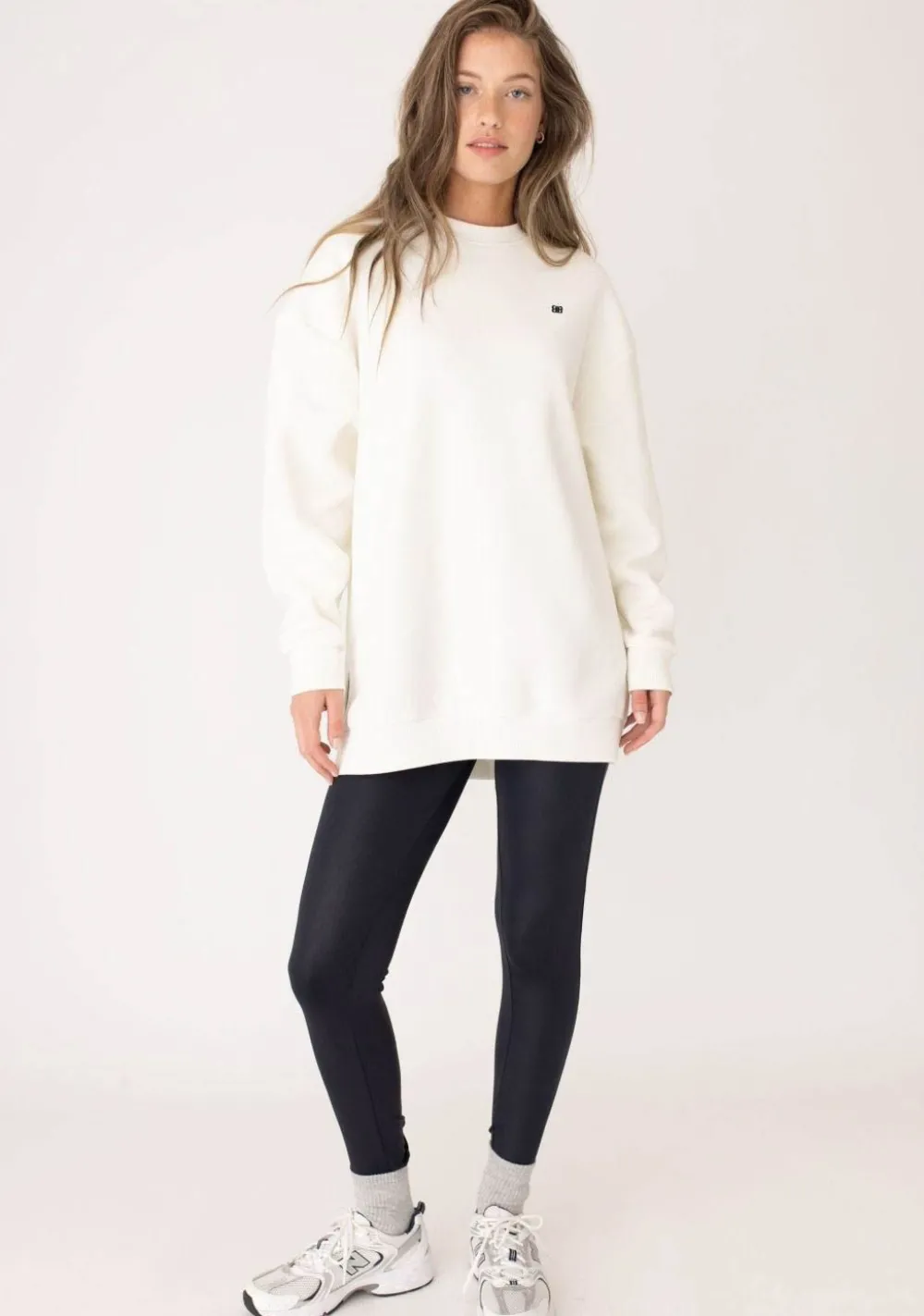 – Het model is 1.76m lang en draagt maat S