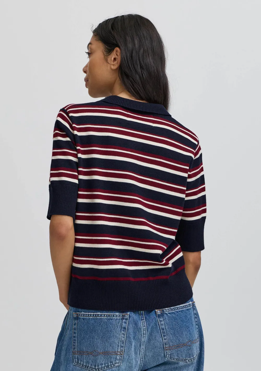 – Het model is 1.76m lang en draagt maat XS