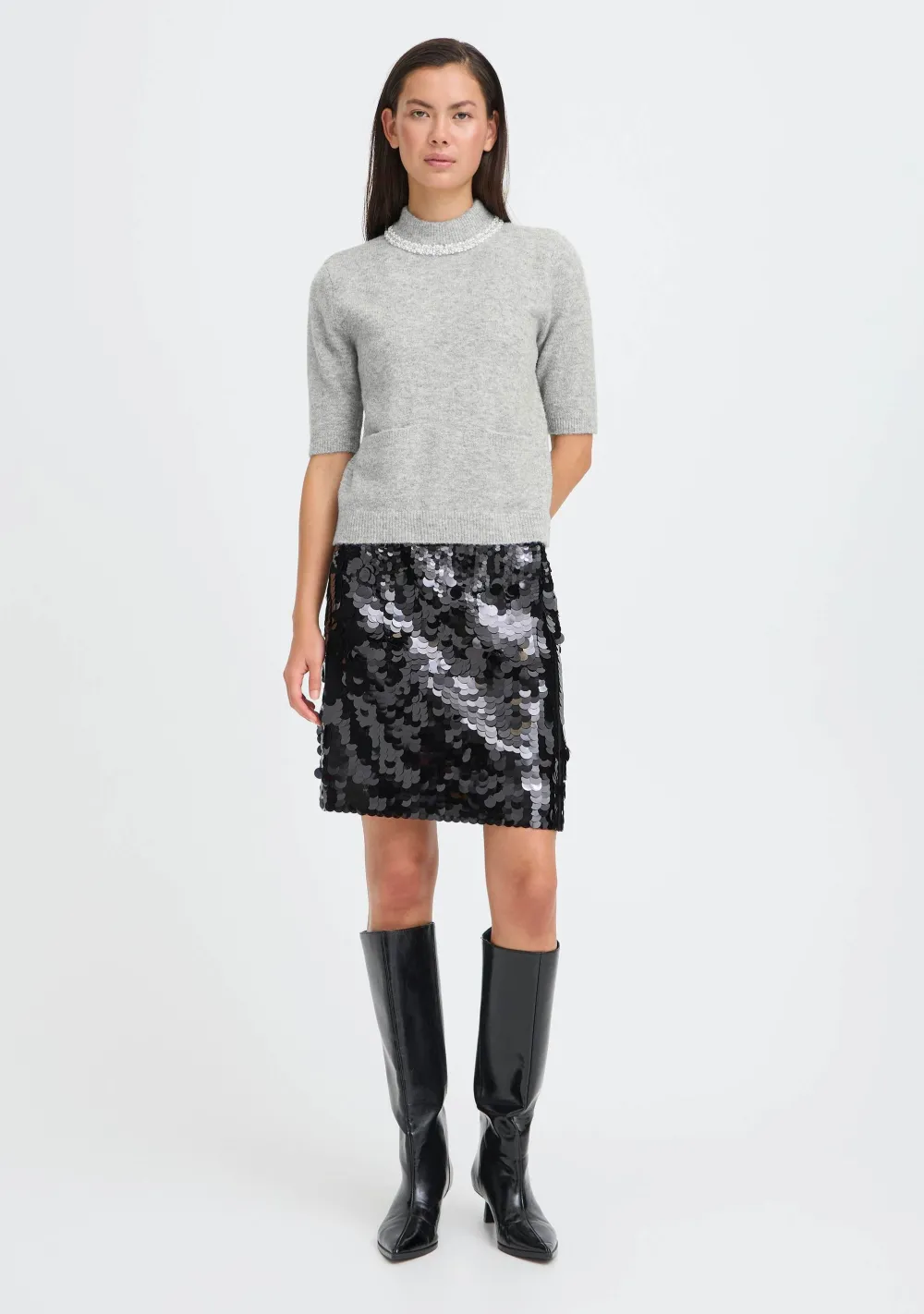 – Het model is 1.76m lang en draagt maat S