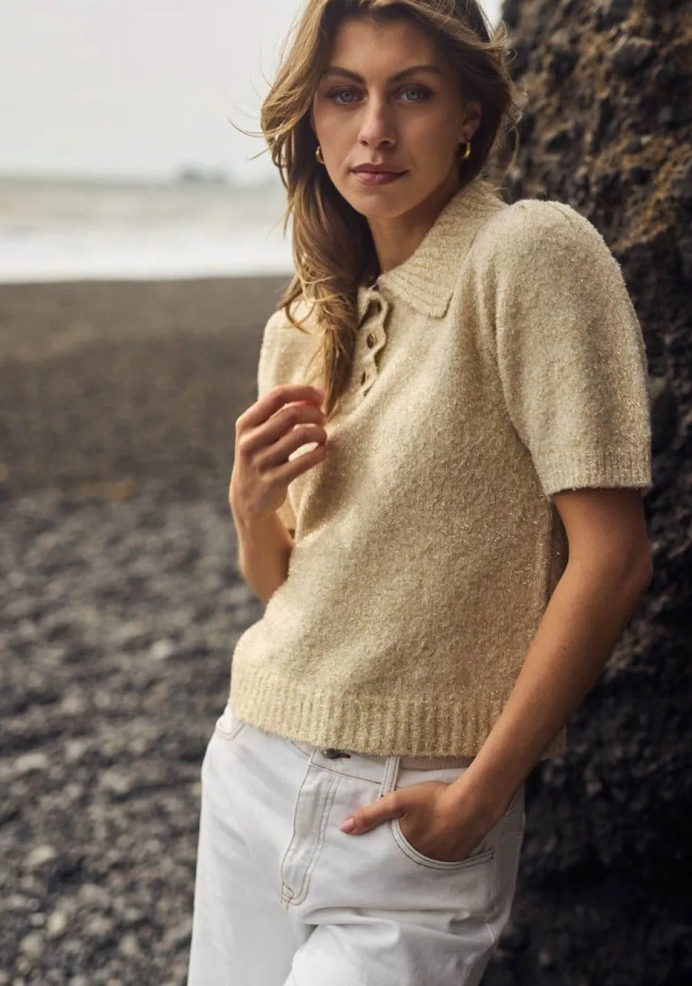 – Het model is 1.76m lang en draagt maat S
