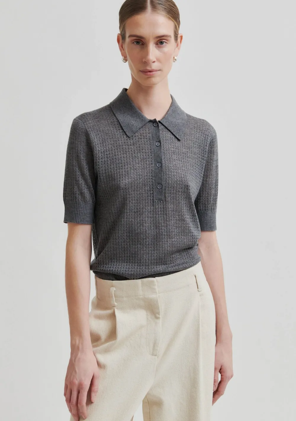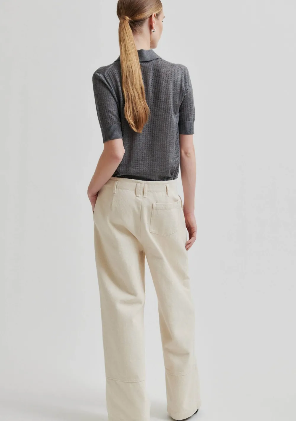 – Het model is 1.76m lang en draagt maat S