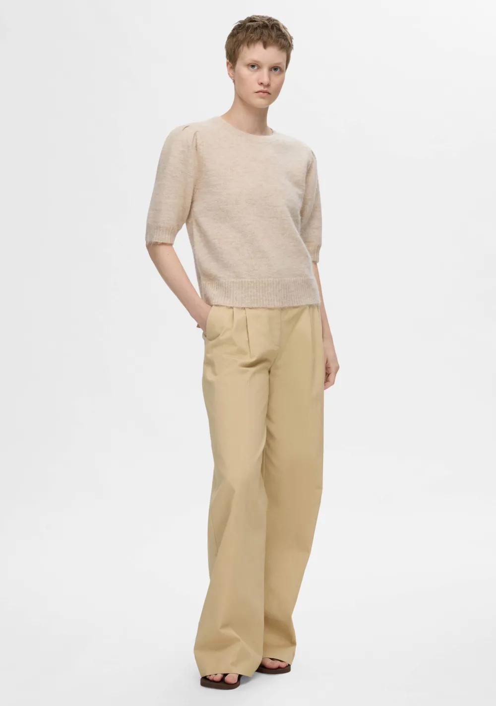 – Het model is 1.76m lang en draagt maat S
