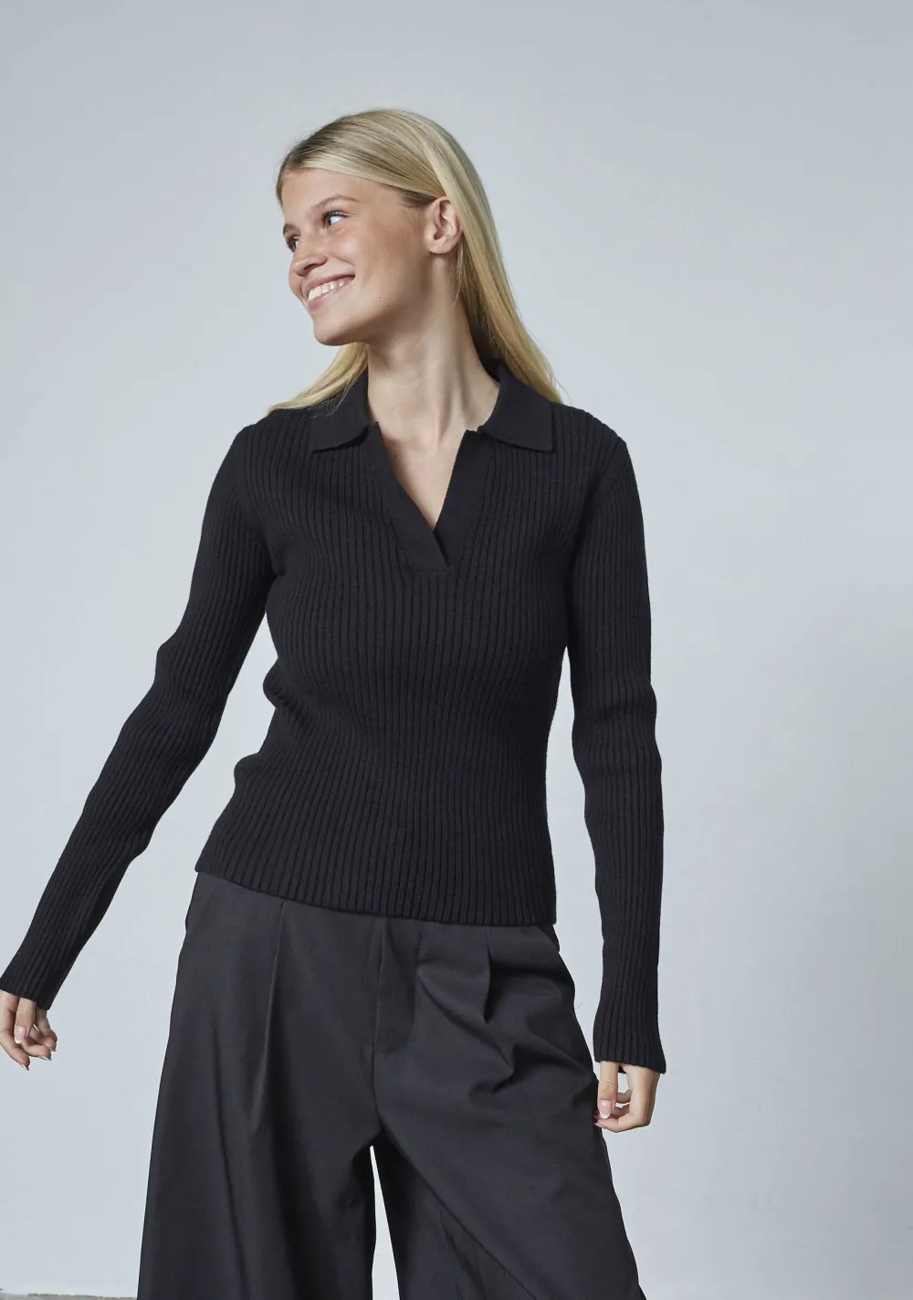 – Het model is 1.76m lang en draagt maat S