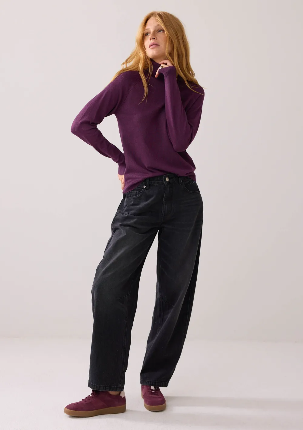 – Het model is 1.76m lang en draagt maat S