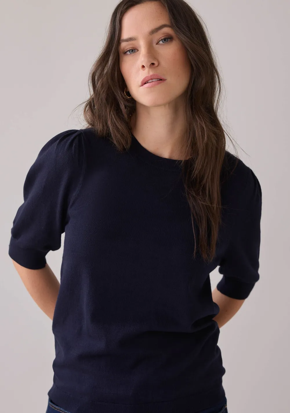 – Het model is 1.76m lang en draagt maat S
