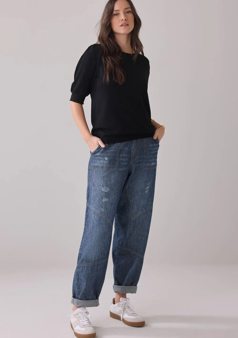 – Het model is 1.76m lang en draagt maat S
