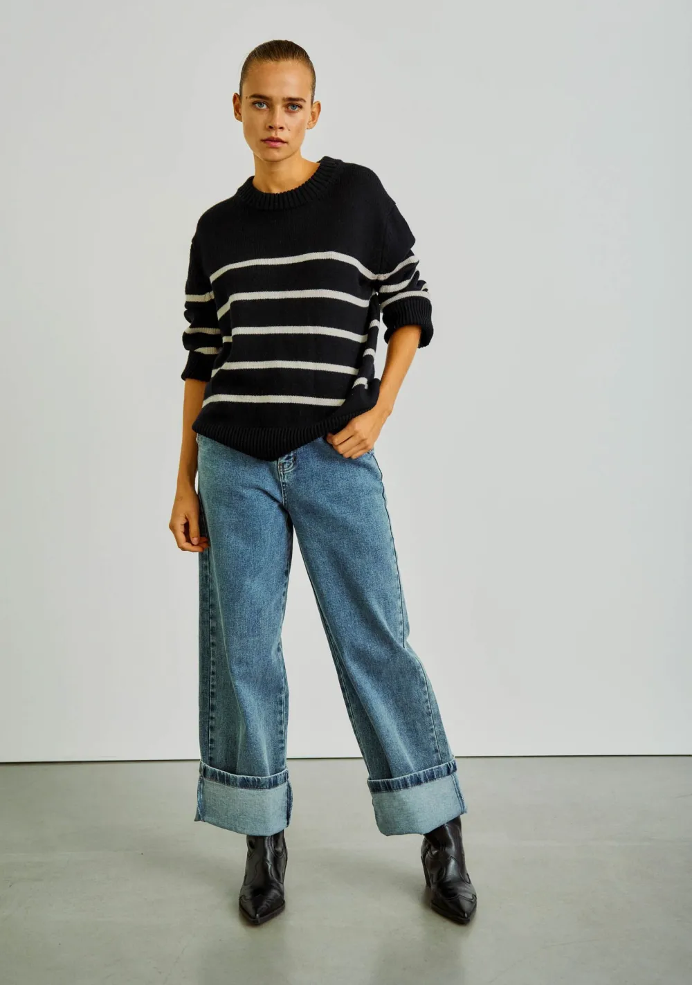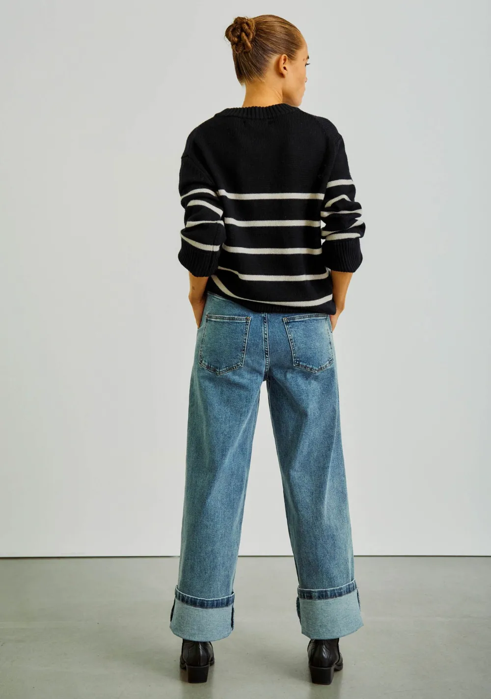 – Het model is 1.76m lang en draagt maat S