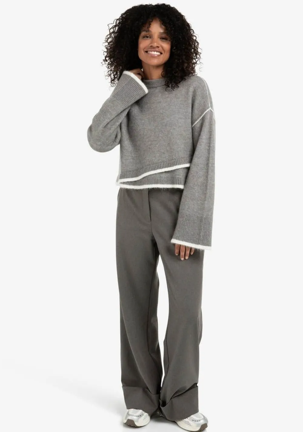 – Het model is 1.73m lang en draagt maat S