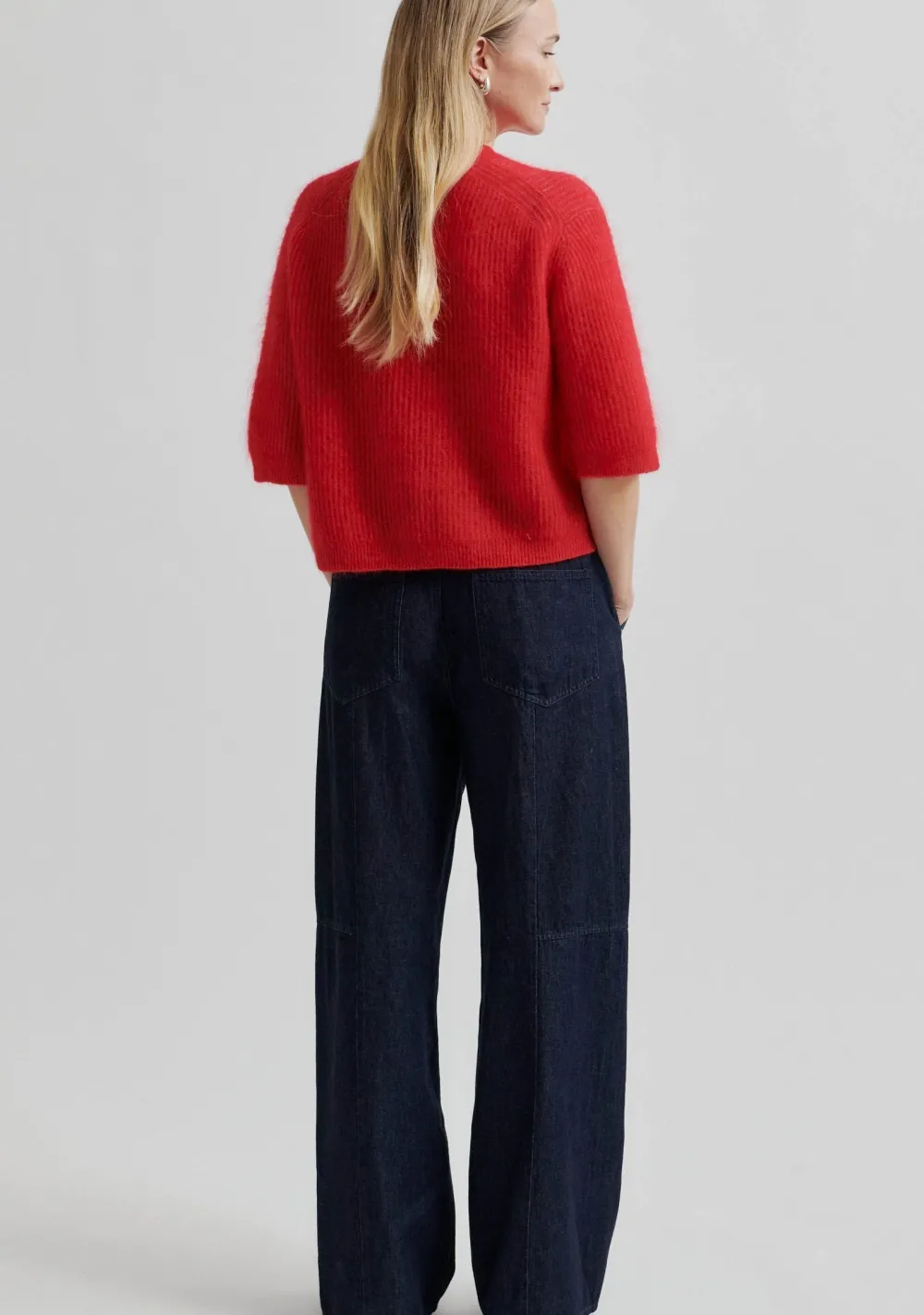 – Het model is 1.76m lang en draagt maat XS