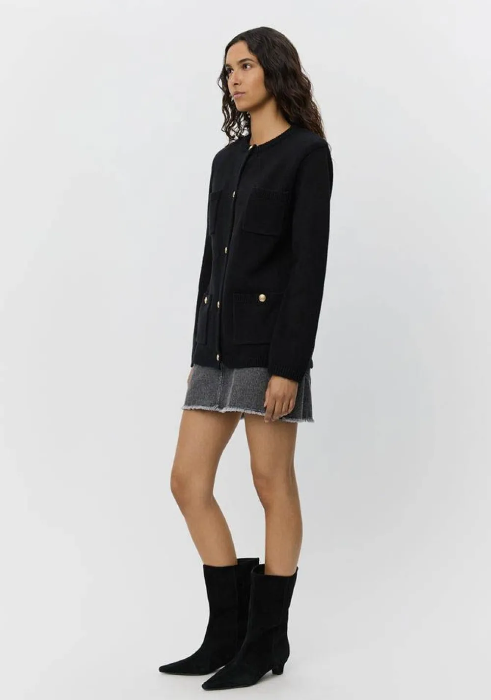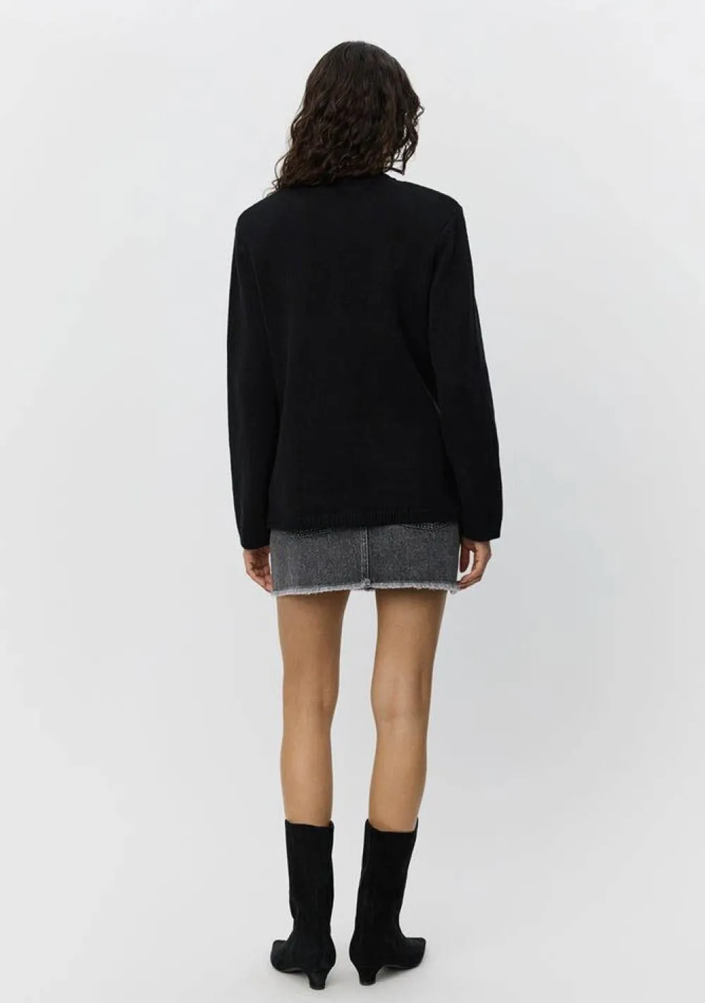 – Het model is 1.76m lang en draagt maat S