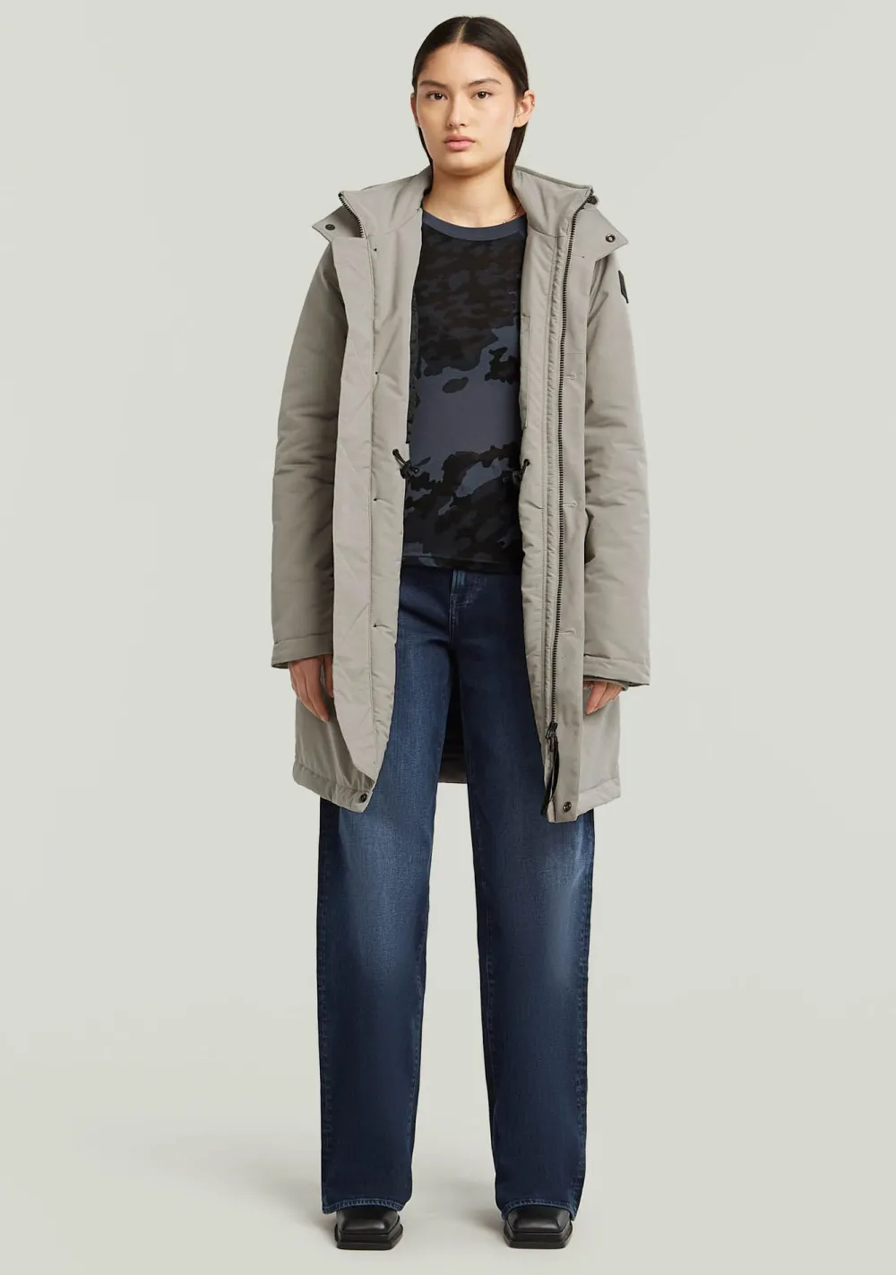 – Het model is 1.76m lang en draagt maat S