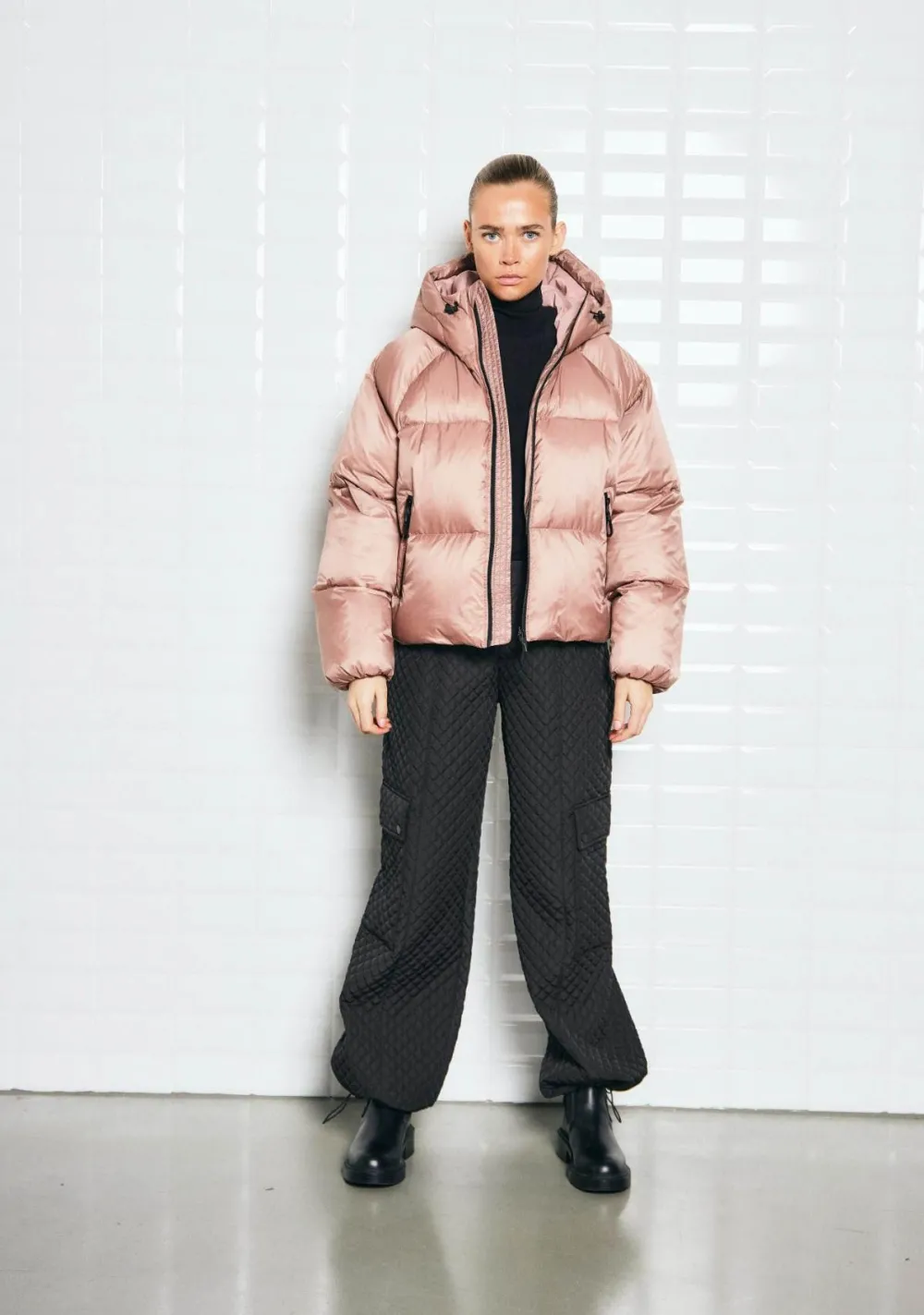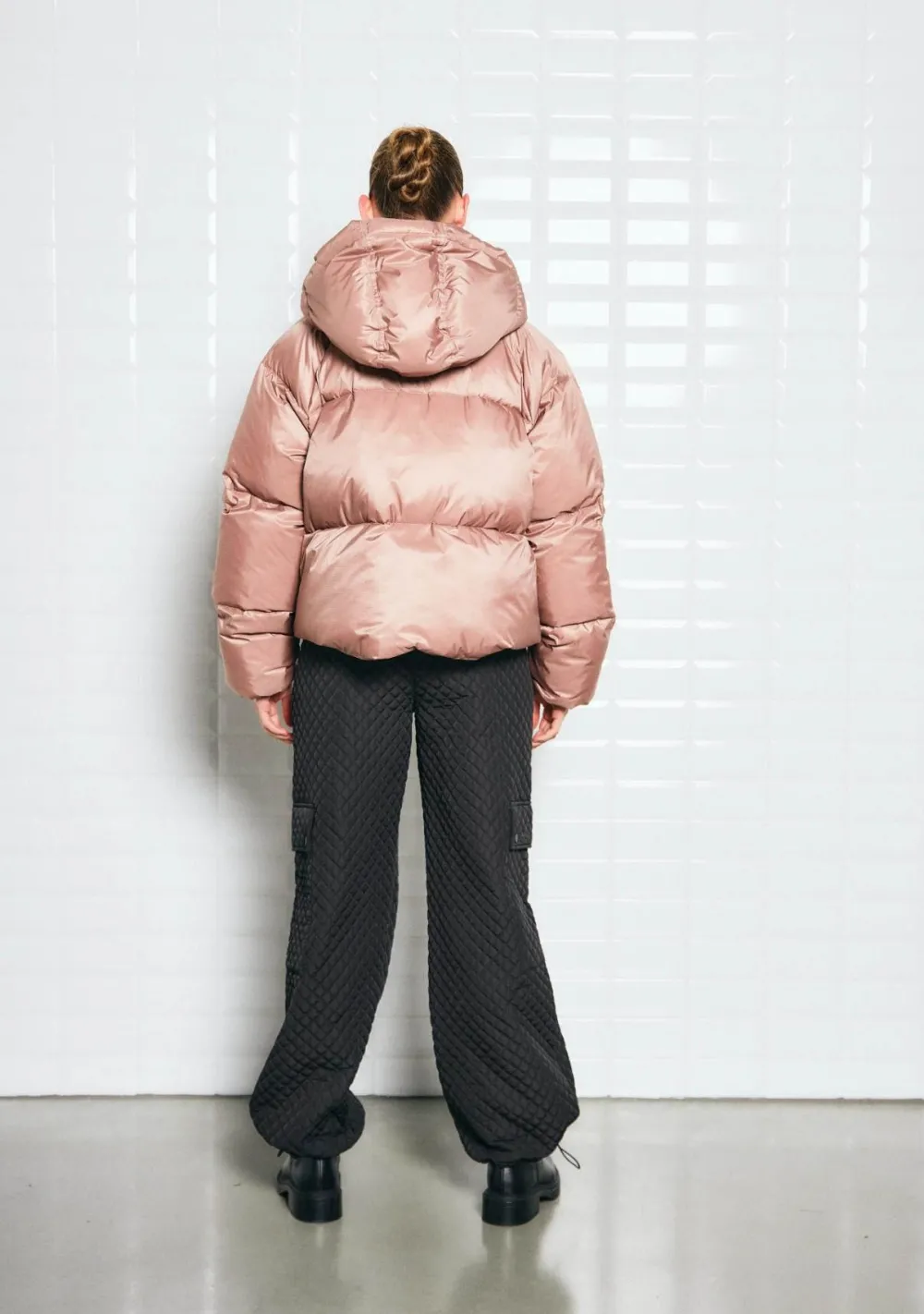 – Het model is 1.72m lang en draagt maat S