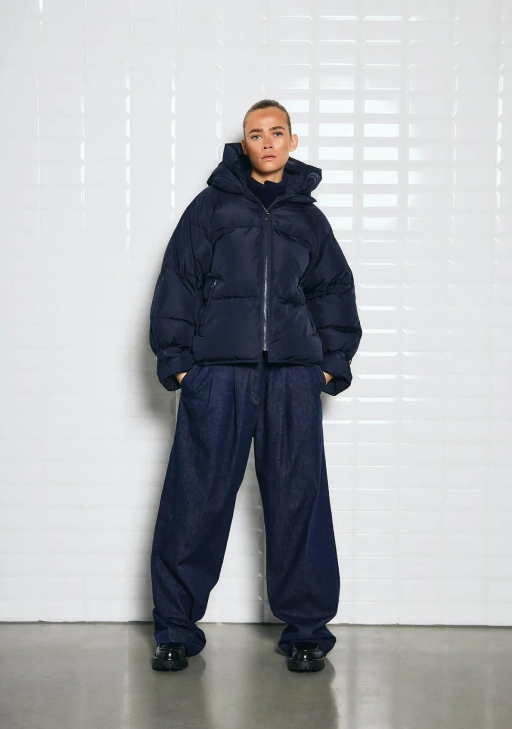 – Het model is 1.72m lang en draagt maat S