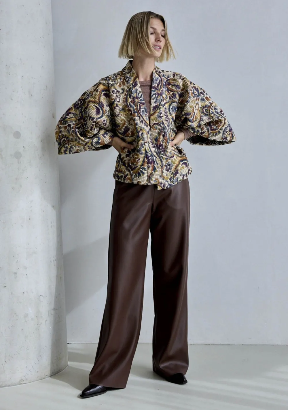 – Het model is 1.76m lang en draagt maat S