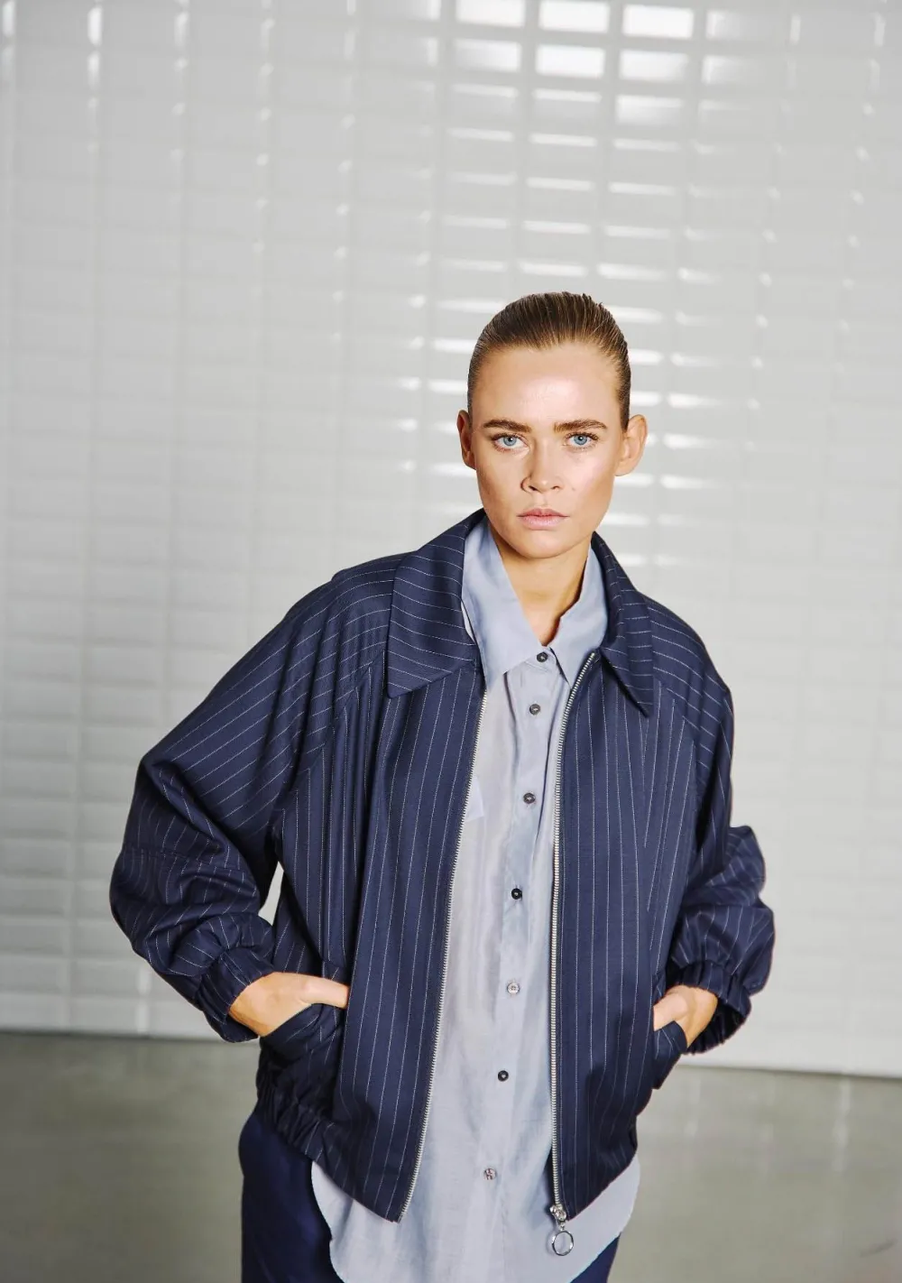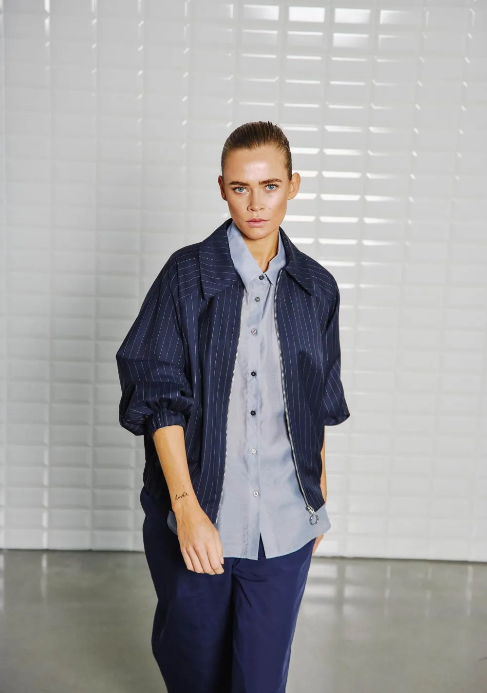 – Het model is 1.76m lang en draagt maat S
