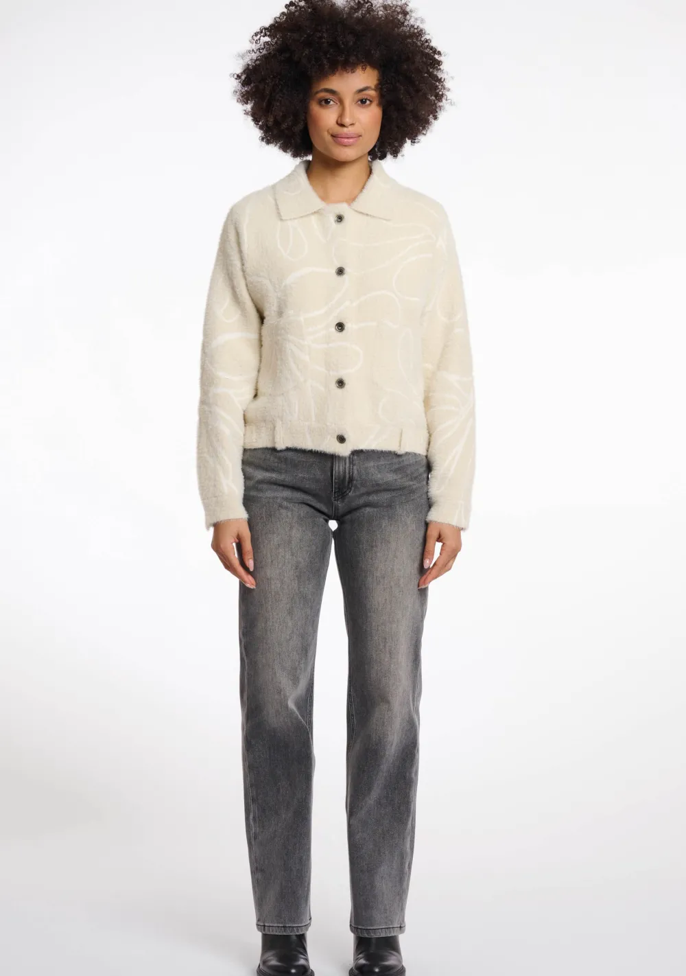 – Het model is 1.76m lang en draagt maat S