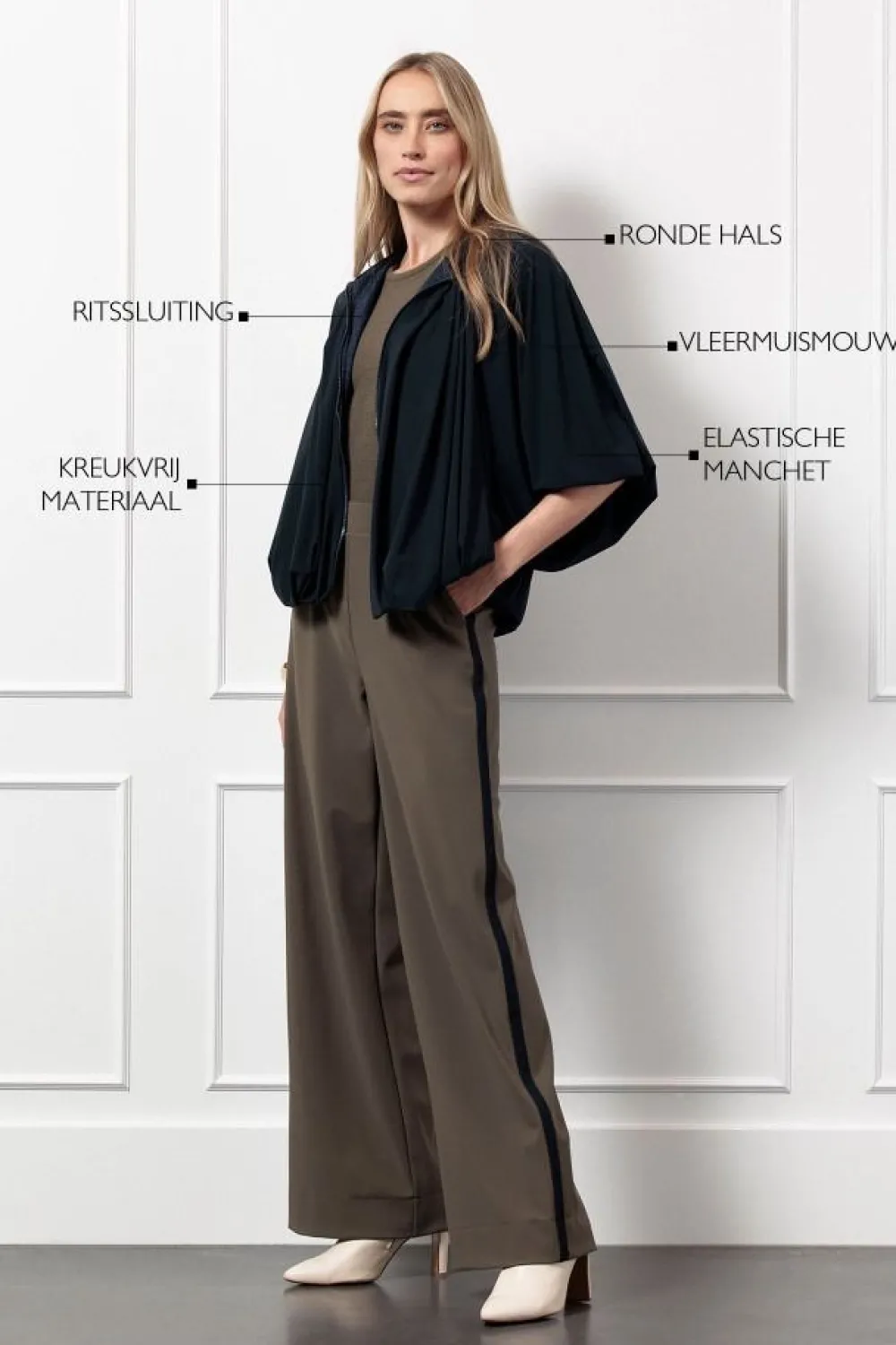 – Het model is 1.76m lang en draagt maat S