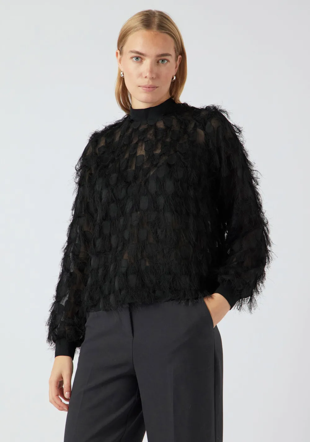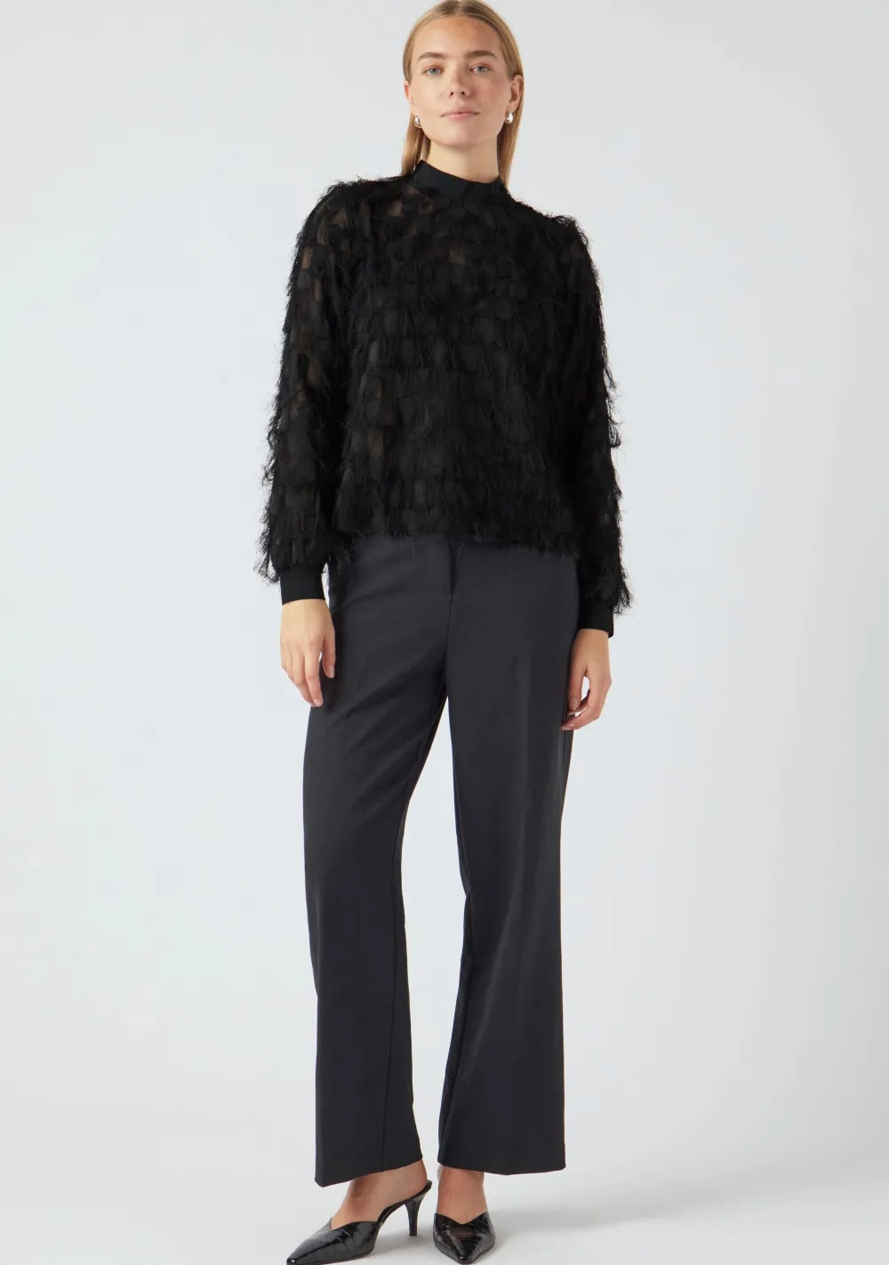 – Het model is 1.76m lang en draagt maat 36