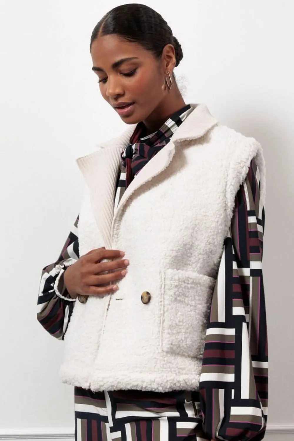– Het model is 1.76m lang en draagt maat S