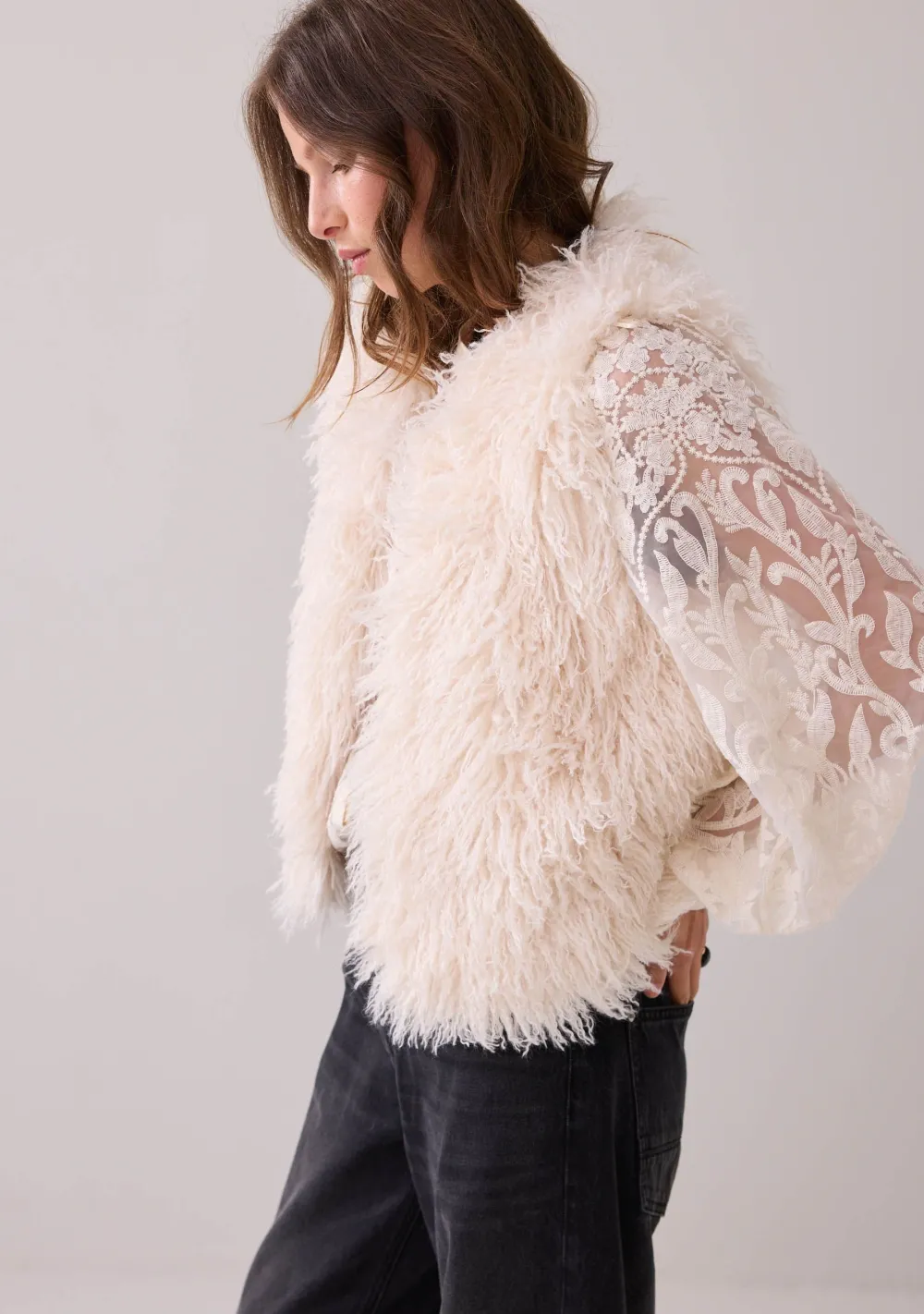 – Het model is 1.76m lang en draagt maat S