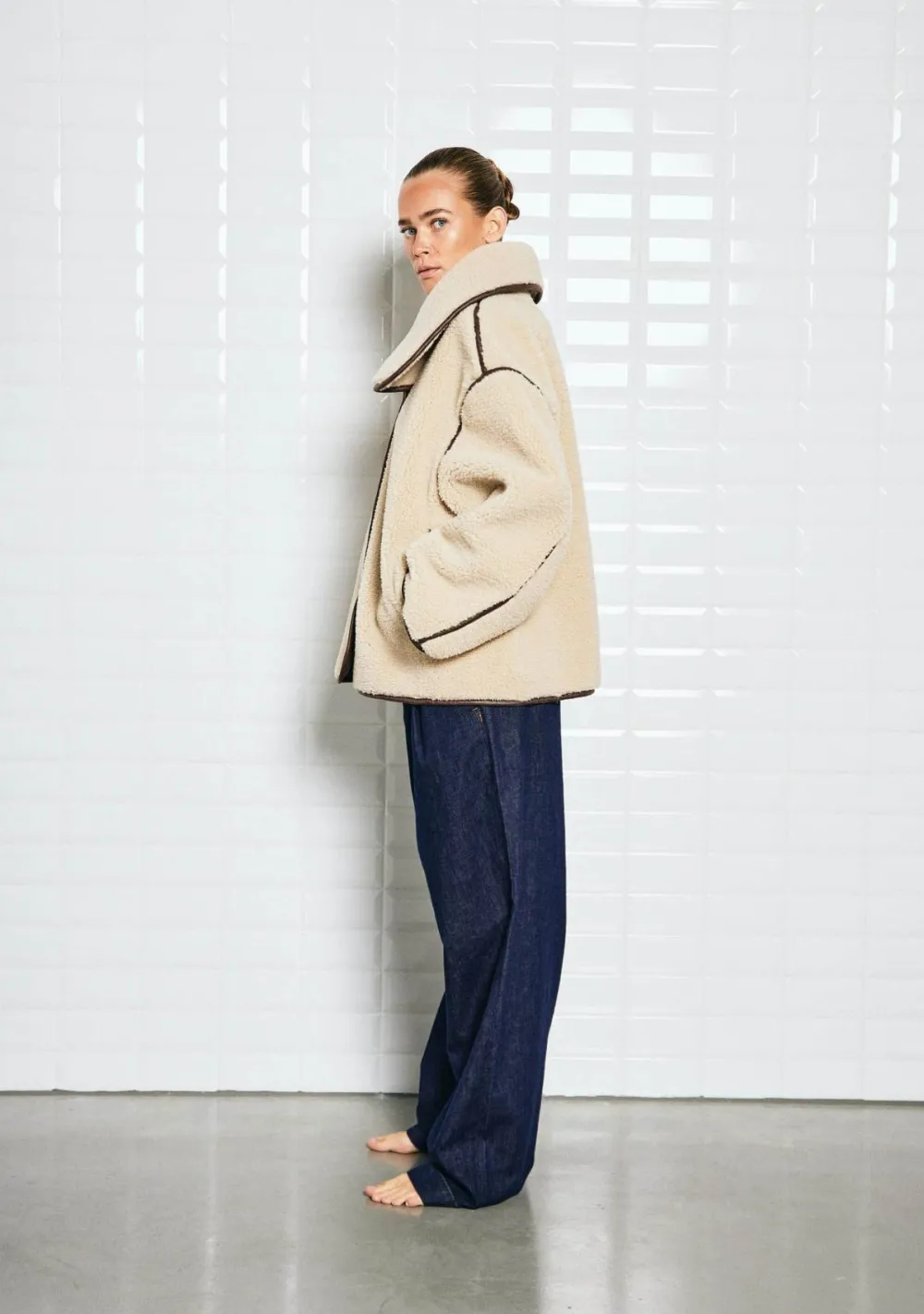 – Het model is 1.72m lang en draagt maat S