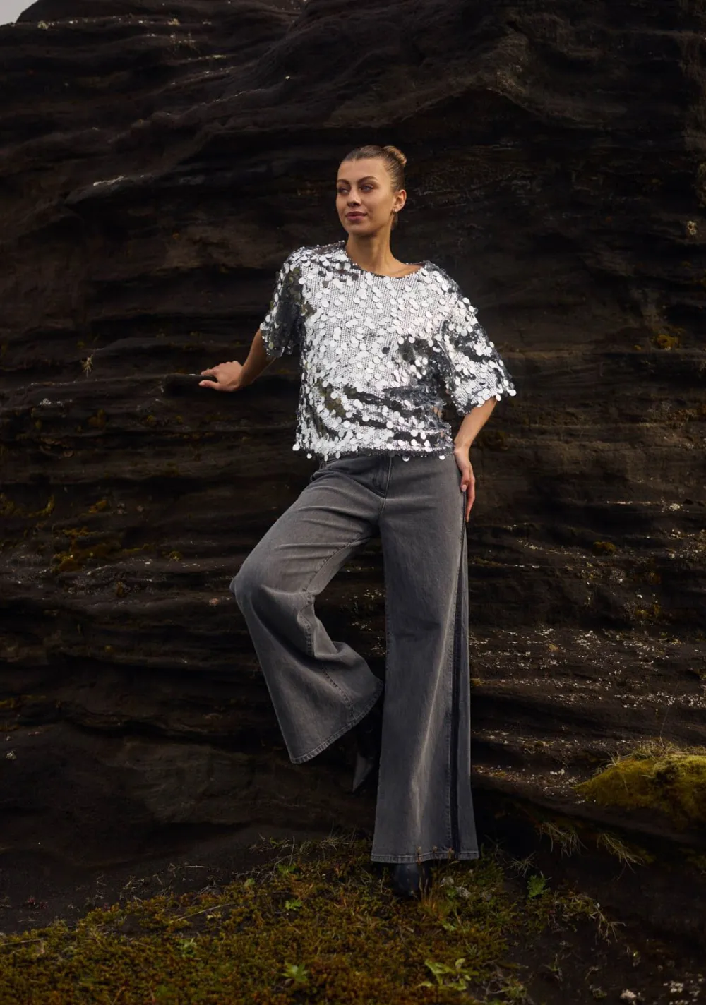 – Het model is 1.76m lang en draagt maat S