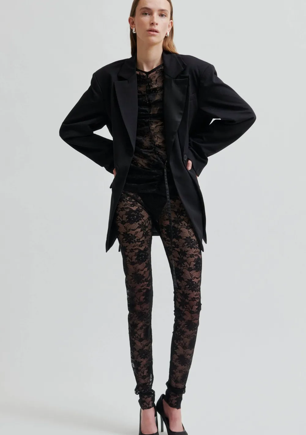 – Het model is 1.76m lang en draagt maat S
