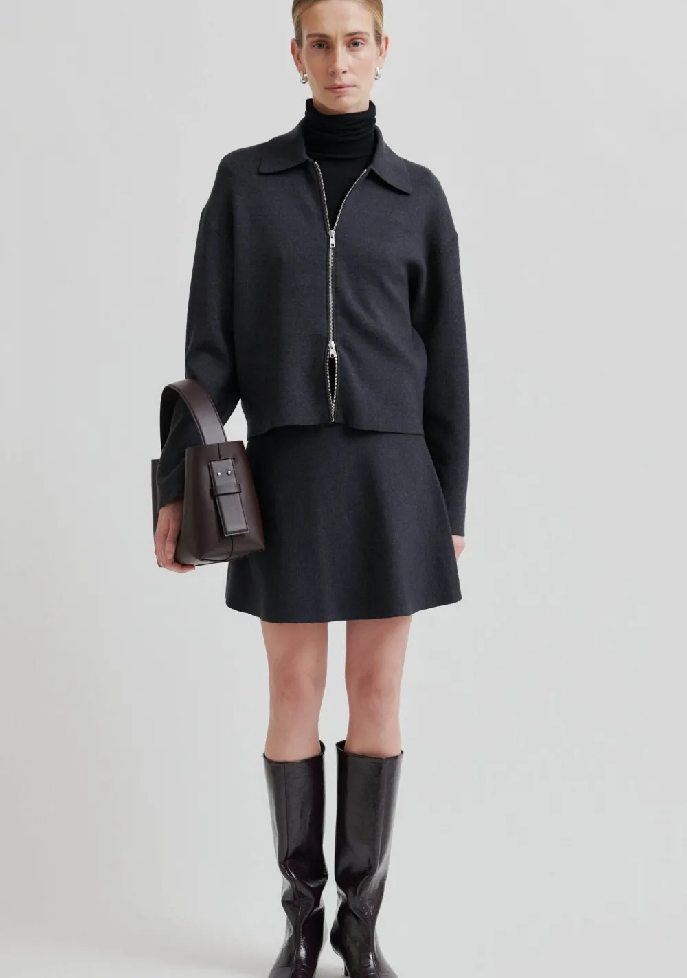 – Het model is 1.76m lang en draagt maat S