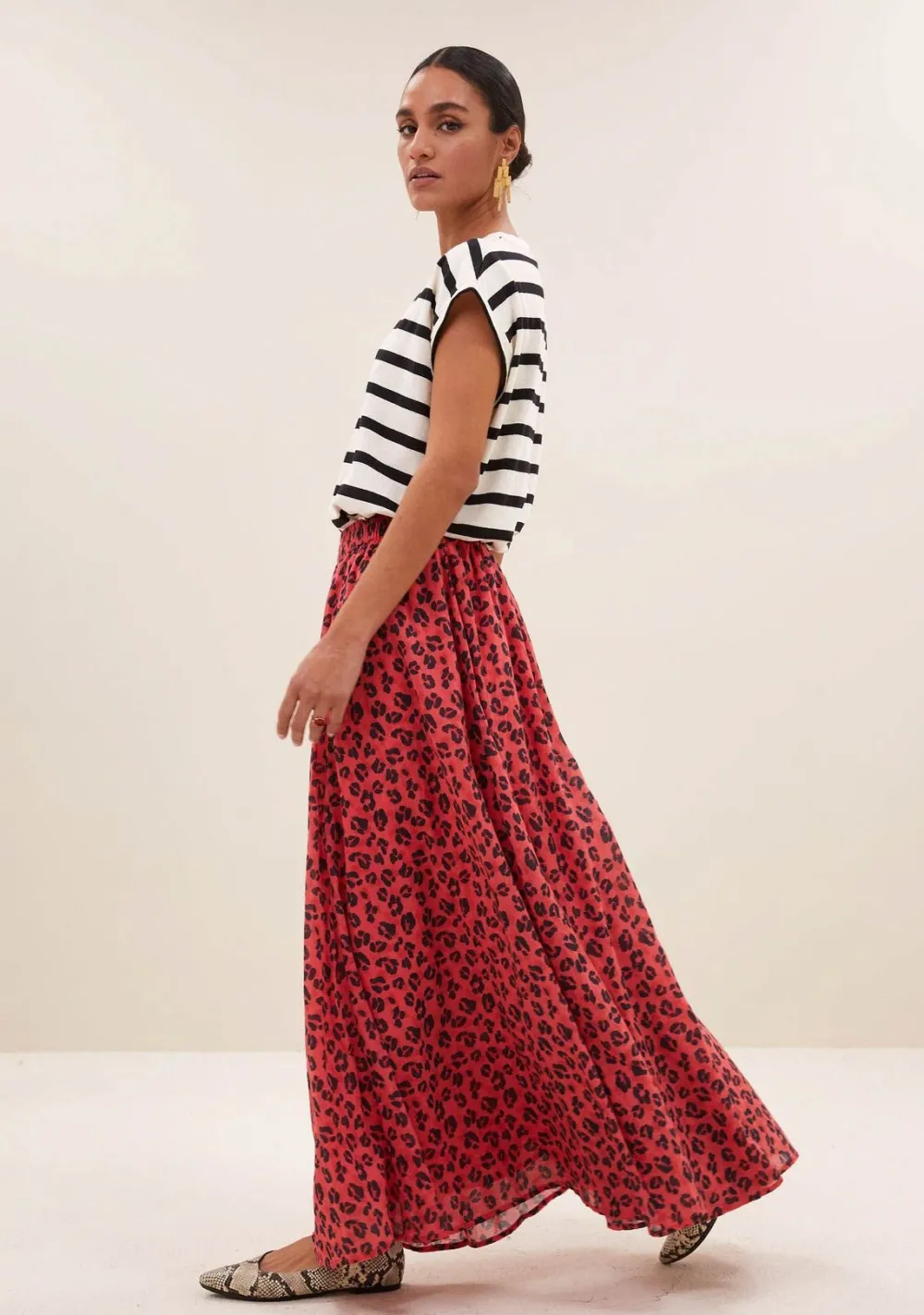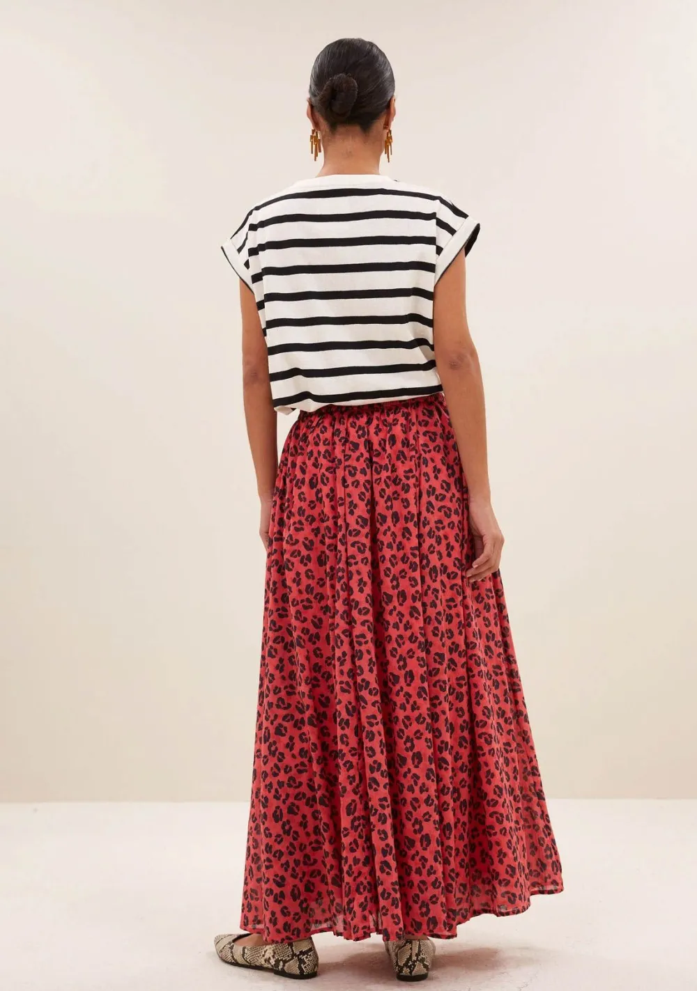 – Het model is 1.75m lang en draagt maat S