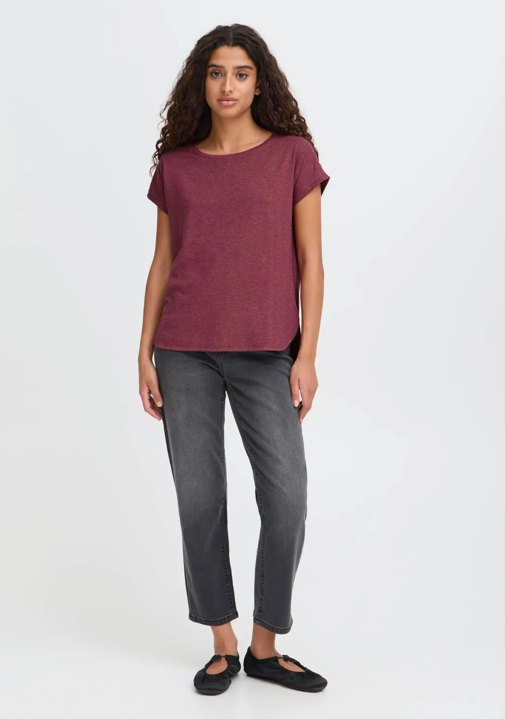 – Het model is 1.76m lang en draagt maat S