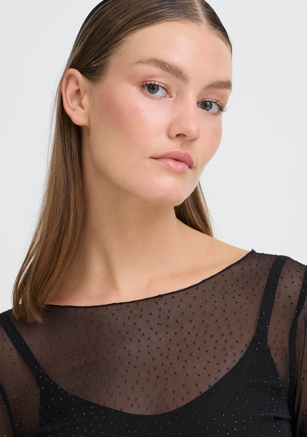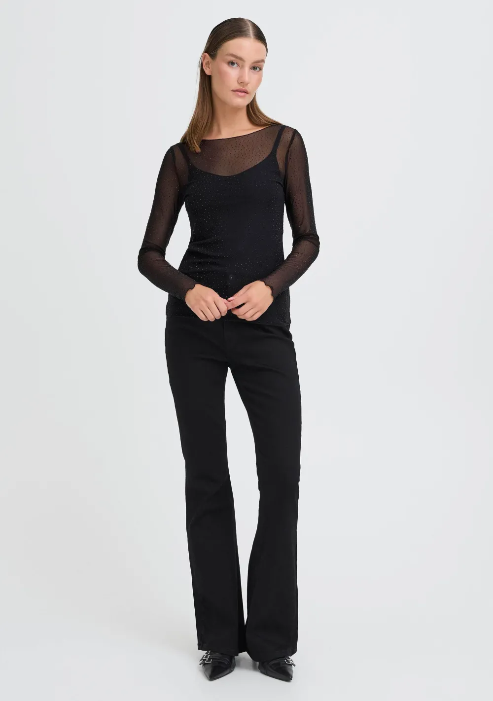 – Het model is 1.76m lang en draagt maat S
