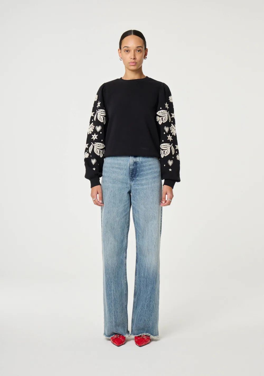 – Het model is 1.76m lang en draagt maat S