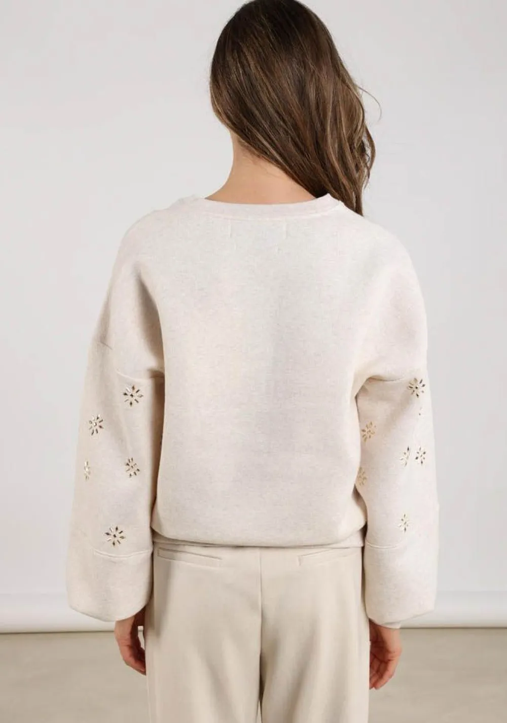 – Het model is 1.76m lang en draagt maat S