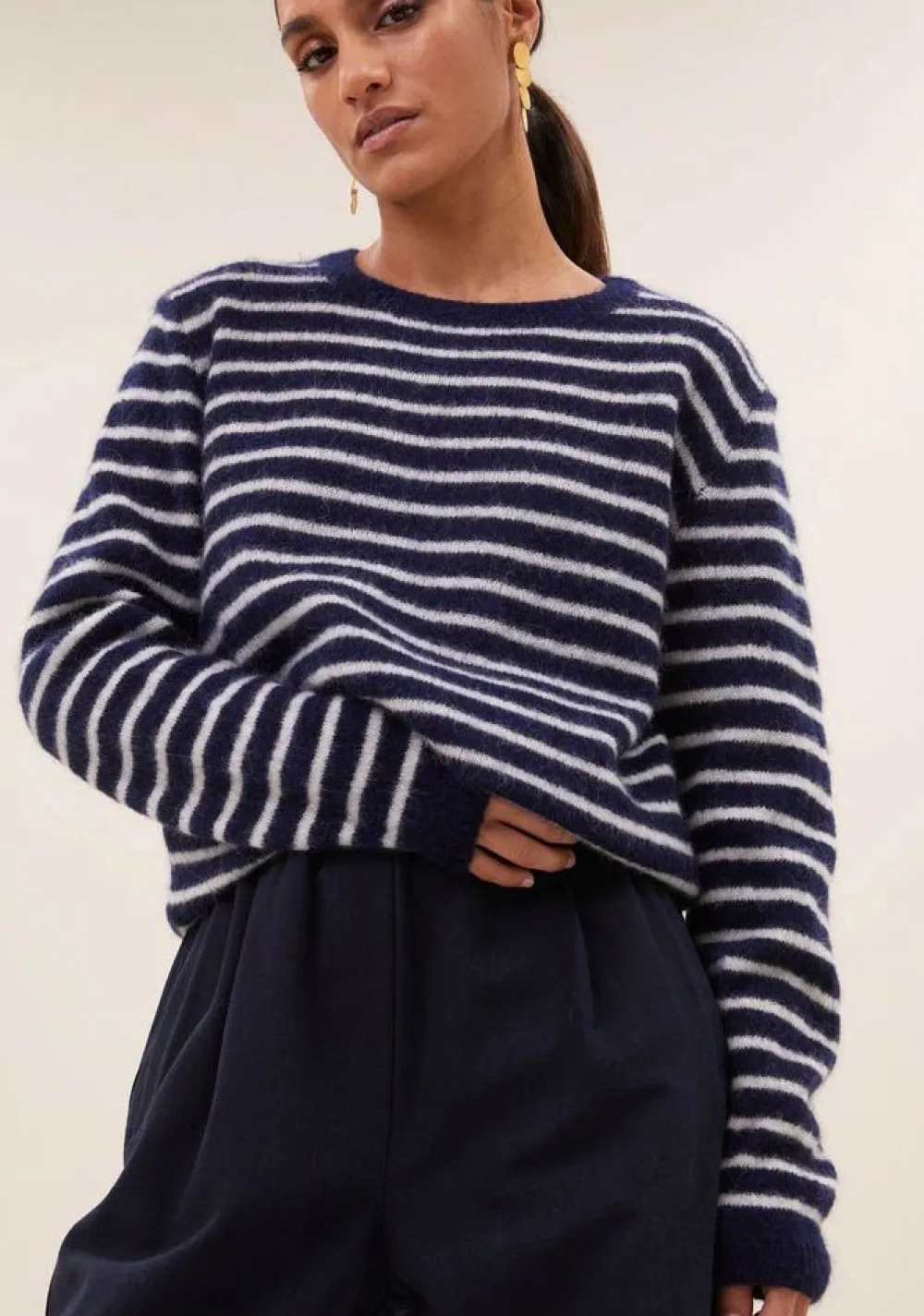 – Het model is 1.75m lang en draagt maat S