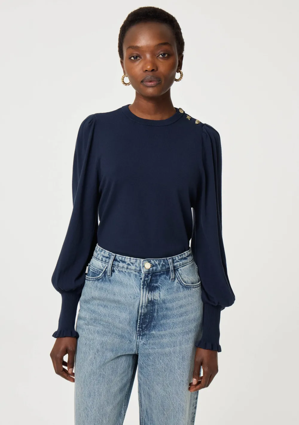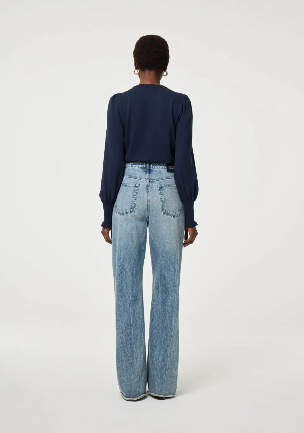 – Het model is 1.76m lang en draagt maat S