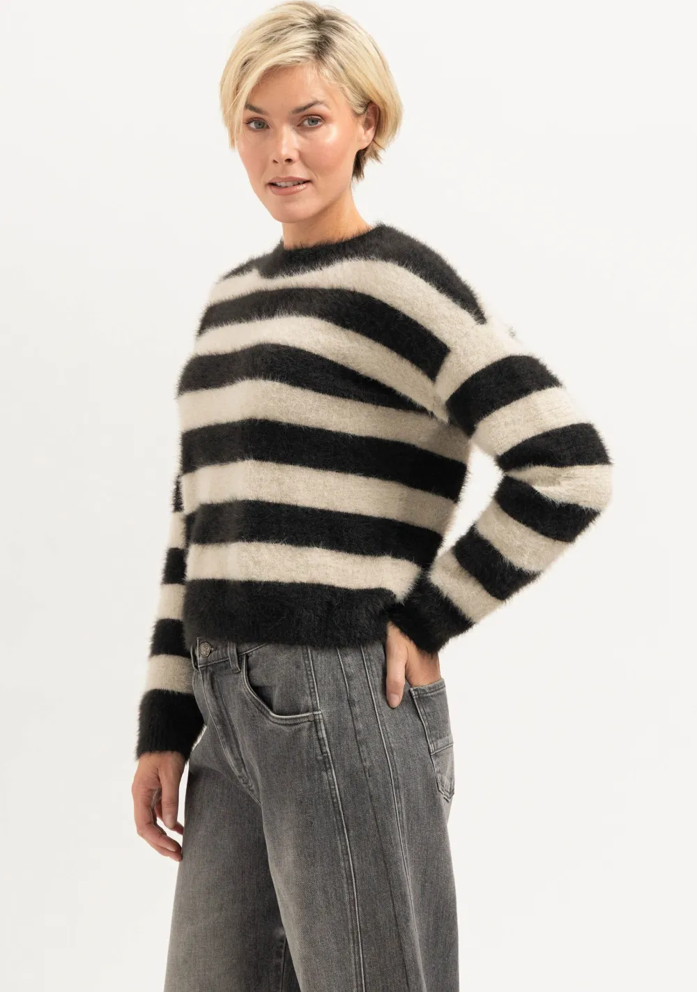 – Het model is 1.76m lang en draagt maat S
