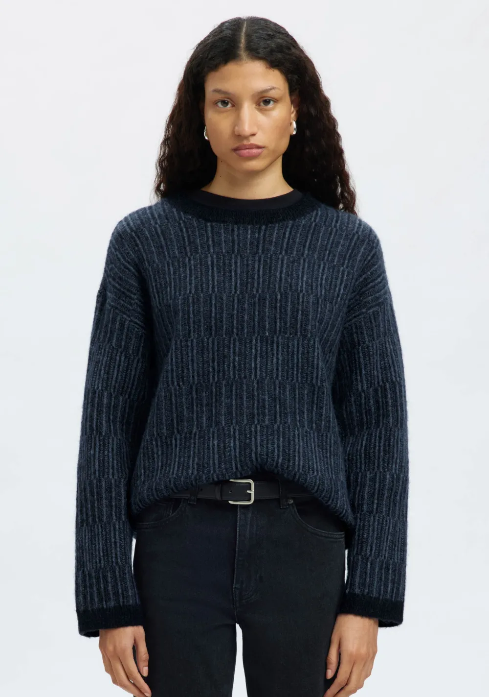 – Het model is 1.76m lang en draagt maat S