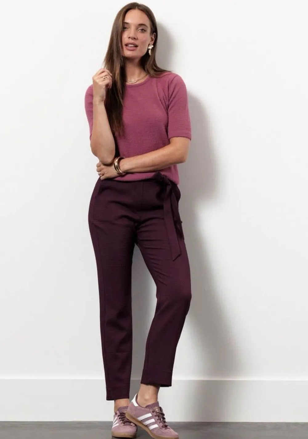 – Het model is 1.76m lang en draagt maat S