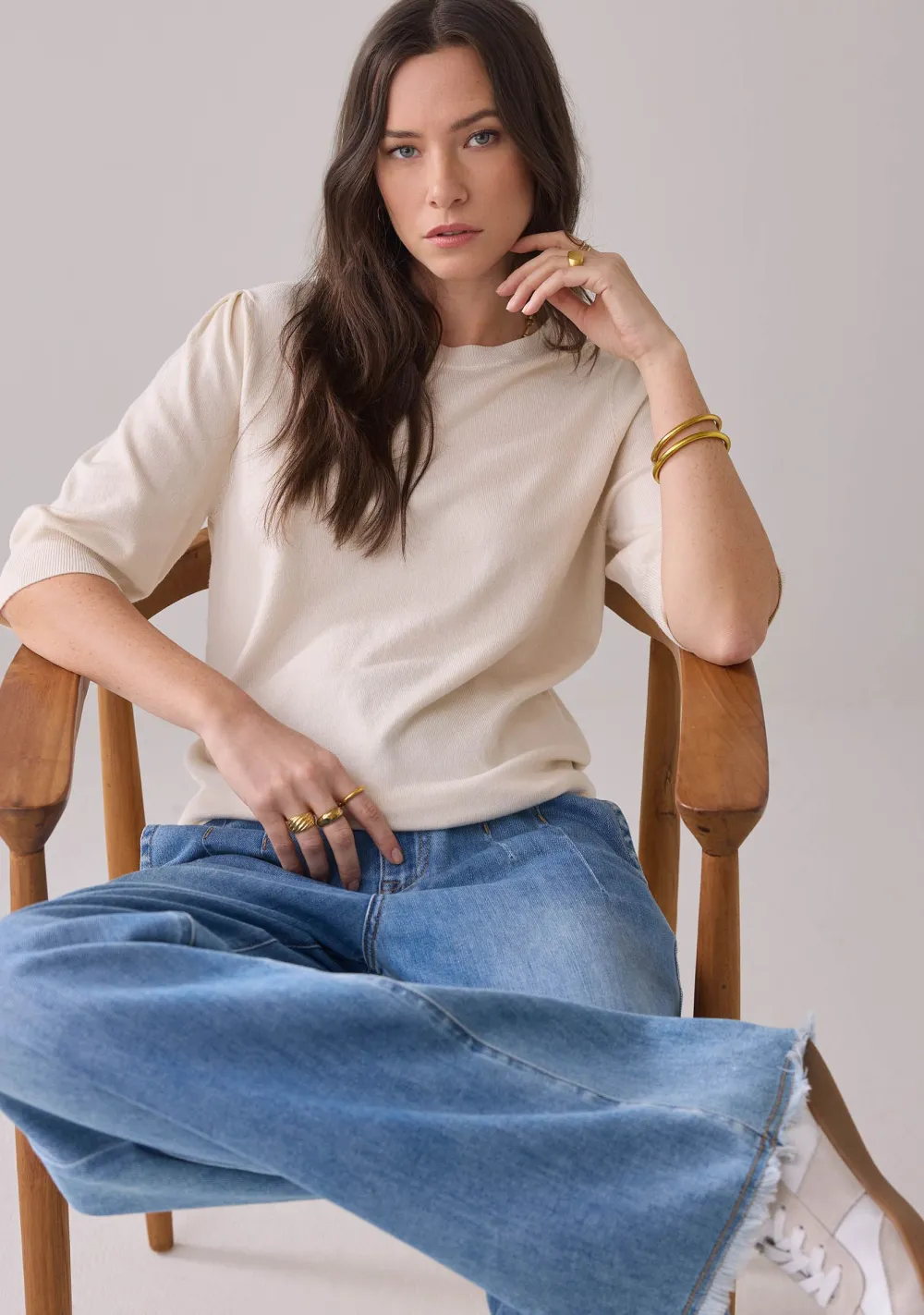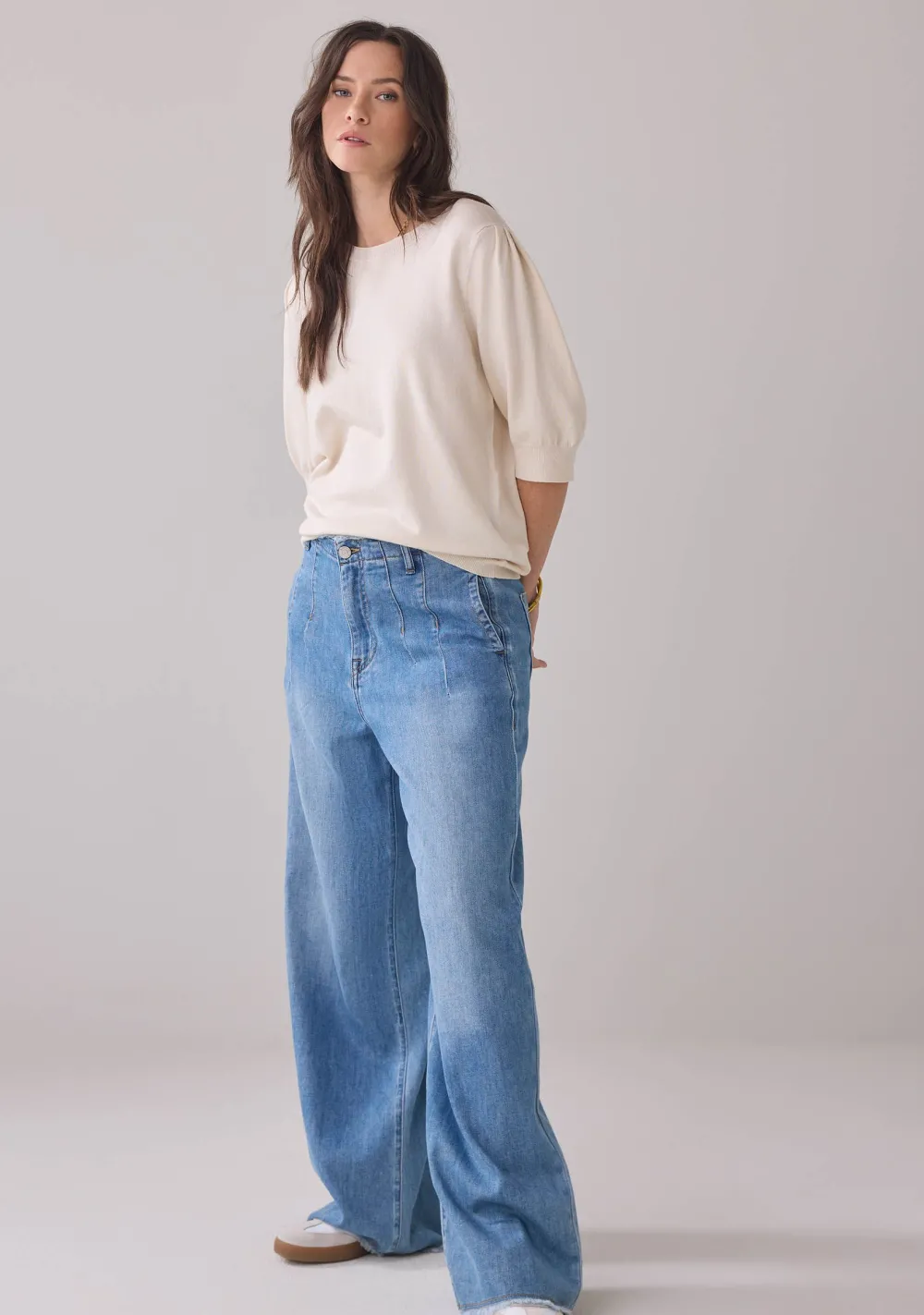 – Het model is 1.76m lang en draagt maat S
